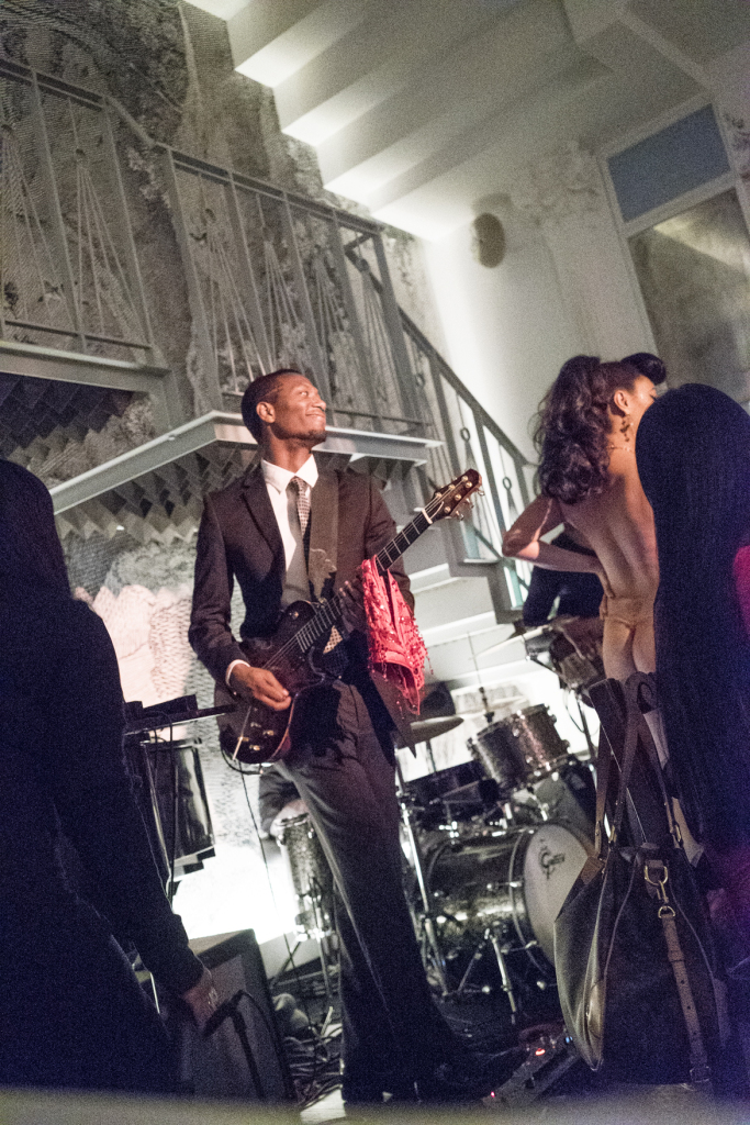 The best part was watching the band as THEY watched the dancers, laughing, crack jokes to one another as they played, etc. The guitarist was getting dresses and bras thrown at him from across the room. He dangled this red sparkly one from his guitar: