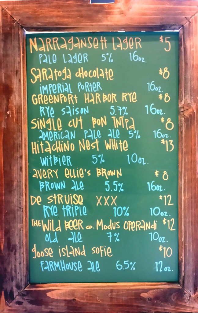 We sat down to a nice beer and a Bloody Mary to start. The Bloody came with some pickled items on top – a beet, a cucumber, and a pepper.