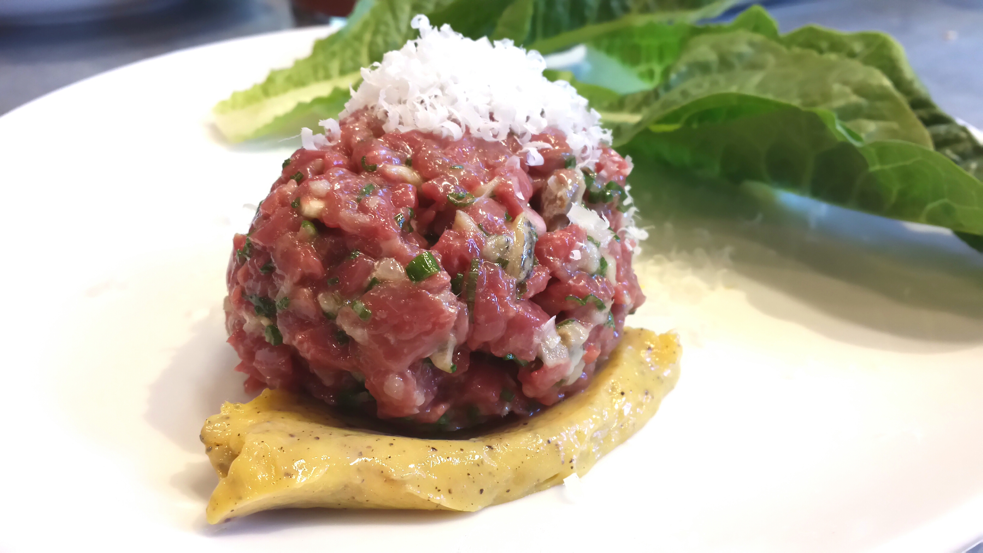 Last was the lamb tartare. You can see below that it’s sitting on top of the little mustard smear that mixed well with the flavorful meat. In the back were the little planks of lettuce upon which we spread the tartare before shoving into our mouths.