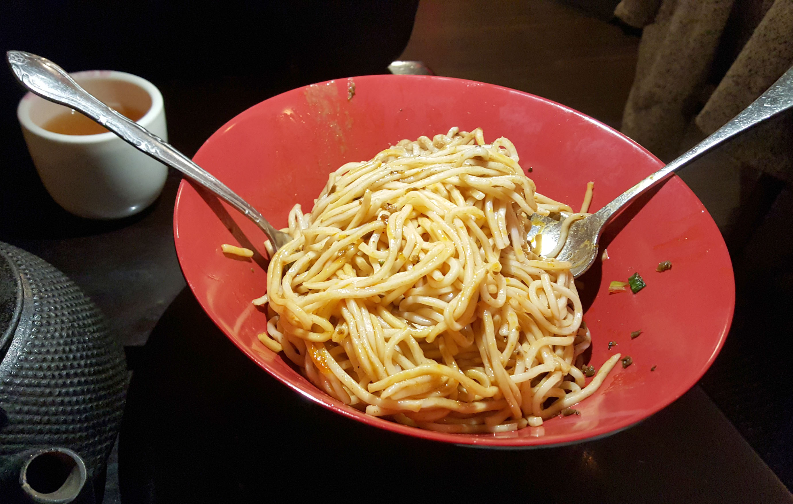 My wife had the dan dan noodles. The mildly spicy peanut sauce is mixed into the noodles table-side for this massive portion of starch.