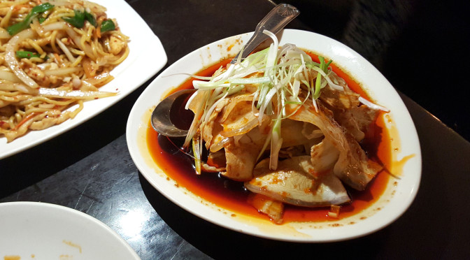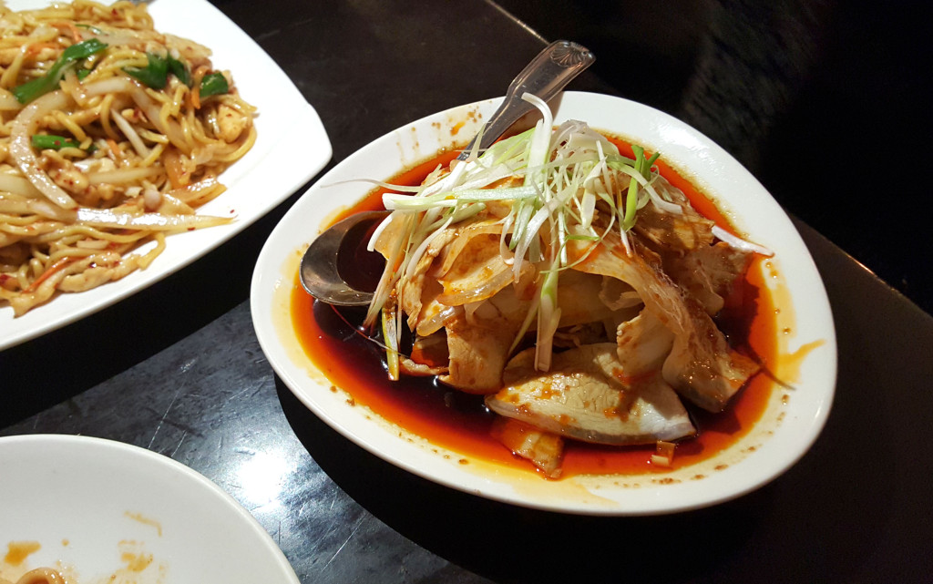 We started with an order of pork belly with chili oil. This was served cold. The texture of the fat on each slice was noodle-like, and the meat was likely boiled and then sliced thin. It had good flavor, and I suppose all that oil is meant to be mixed into the big bowl of rice that comes with it. Honestly we could have been full just from that alone. Portion sizes are massive here.