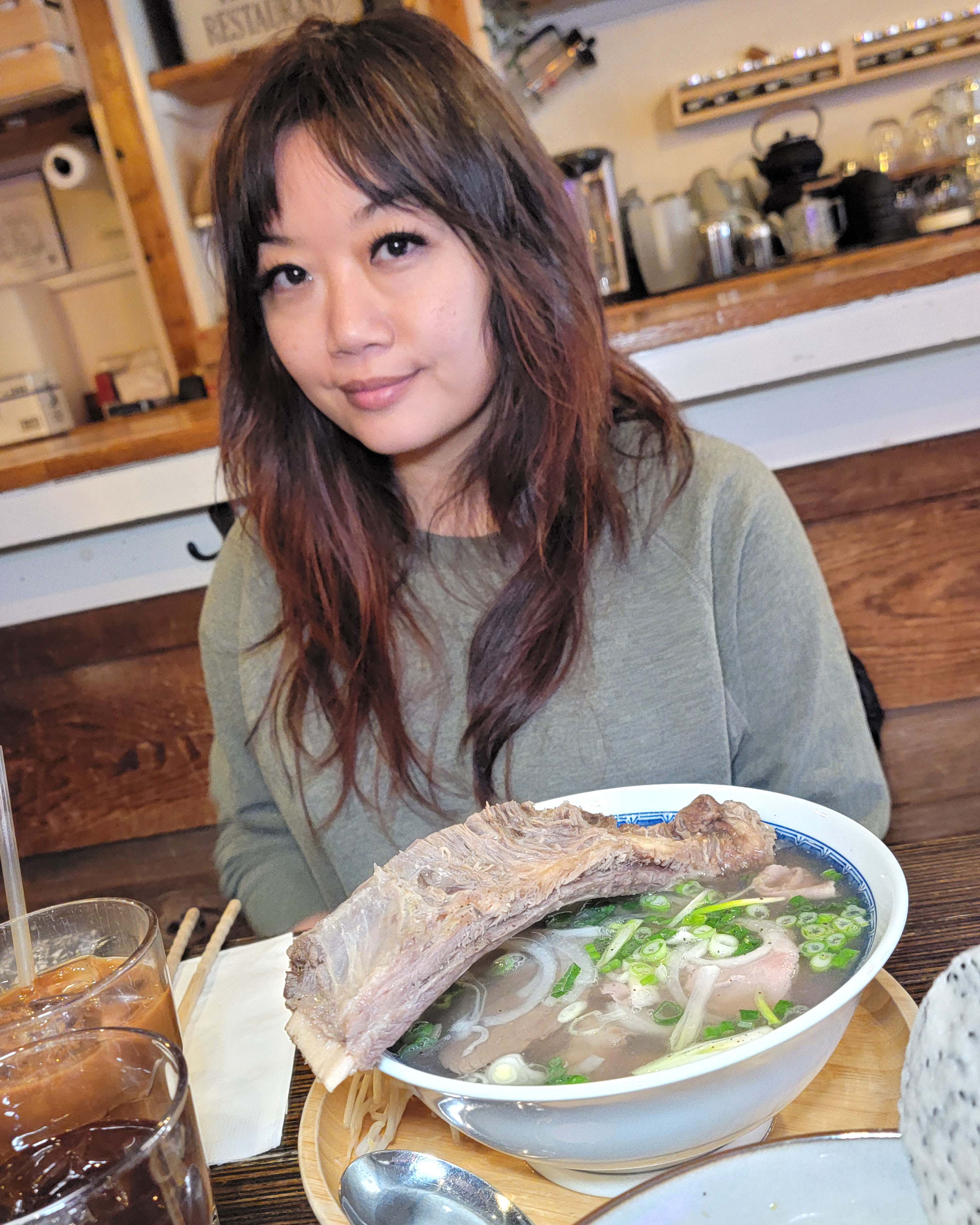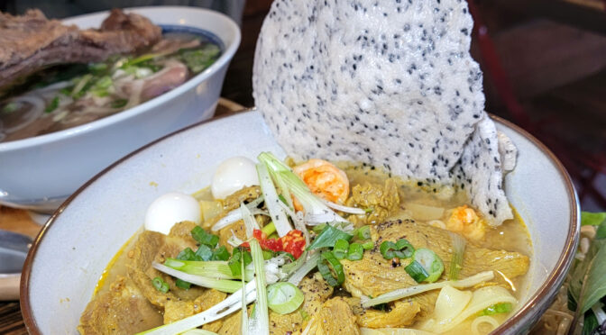 My wife and I stopped in this small Vietnamese joint for a quick lunch. I had the turmeric noodles with pork and shrimp, and she had the special pho.