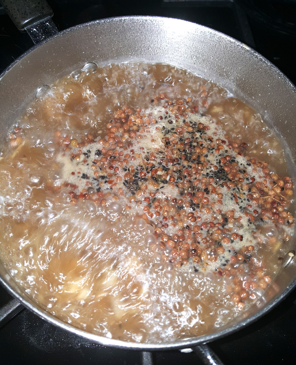 Then I added some extra water, a packet of Tonkotsu pork ramen seasoning, black garlic oil, sesame oil, sesame seeds (toasted and regular), dried garlic chips and a huge heap of spicy, mouth-numbing Szechuan peppercorns. This was to be my hot pot broth/ramen base hybrid. See it bubbling up below:
