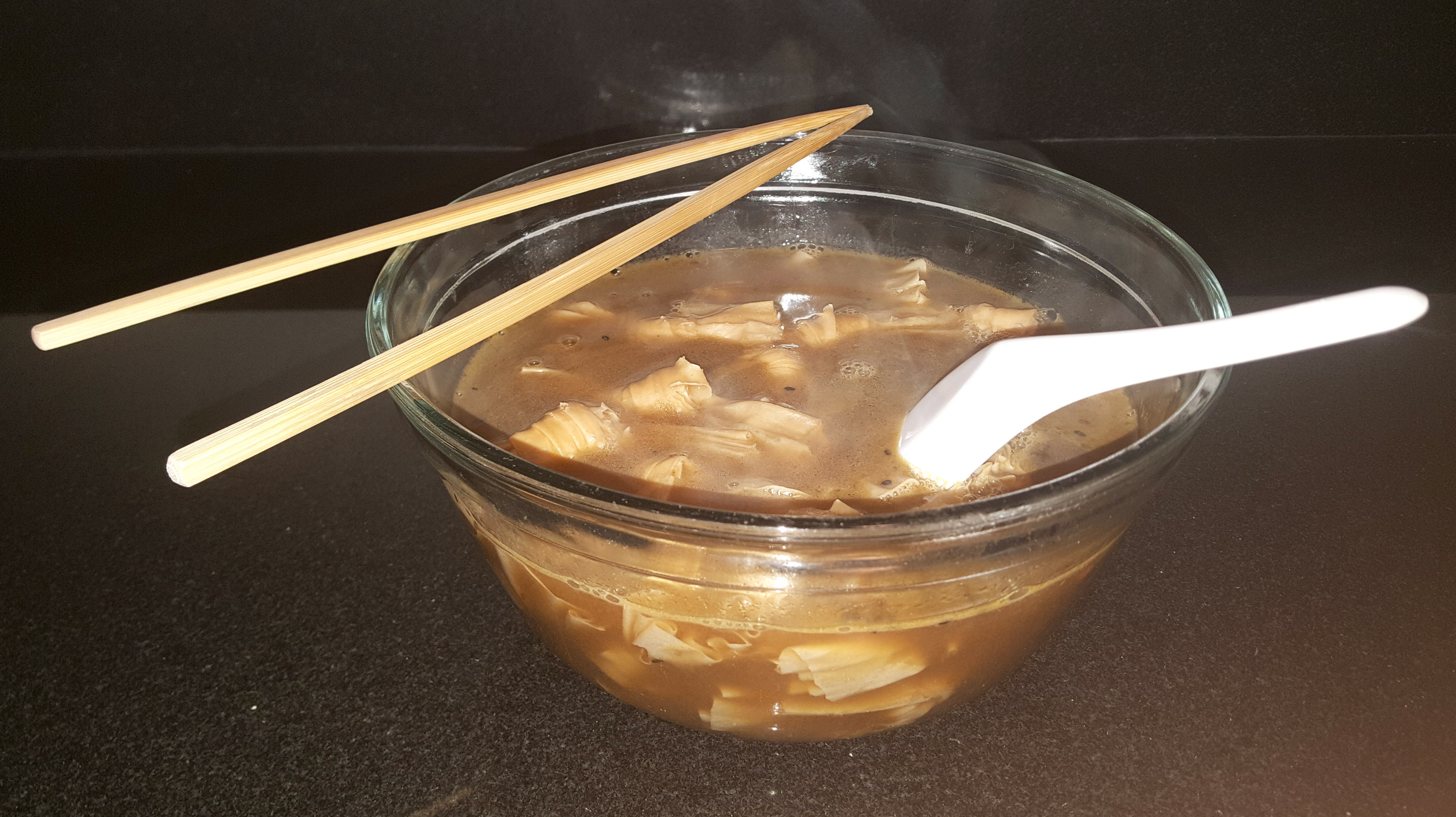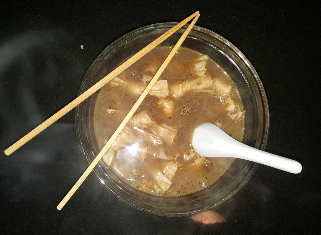 The end result was a pretty tasty and spicy soup. Not so bad for a home episode of Chopped. Just strain off the junk that is floating around in the broth first, that way you have a nice clean soup as an end-product.