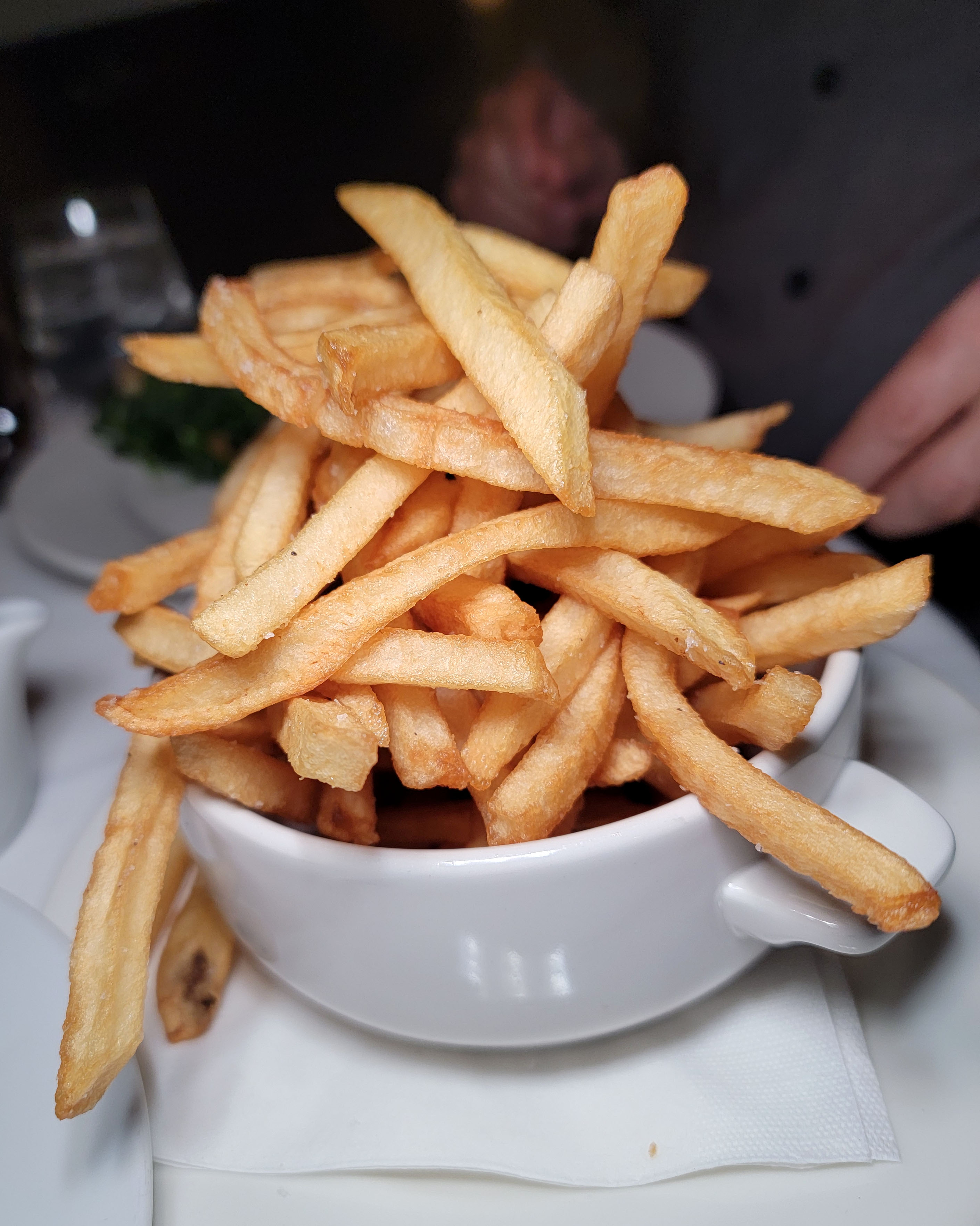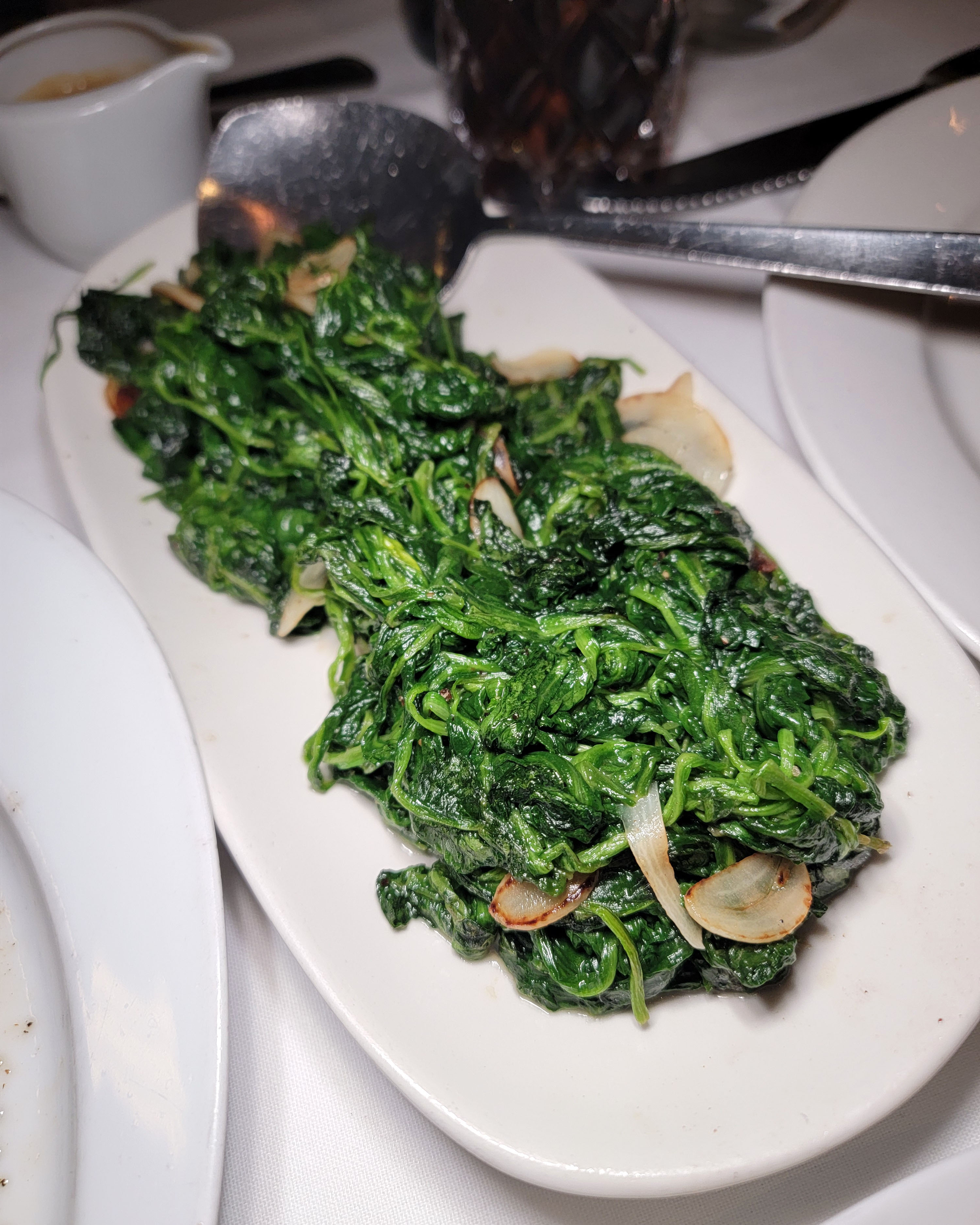 We tried the garlic sauteed spinach and the fries on the side. Both were good, but the fries stole the show here for me. We did not try any desserts (just coffee).