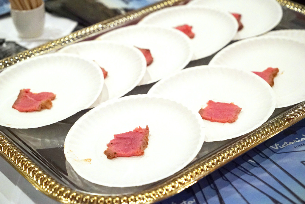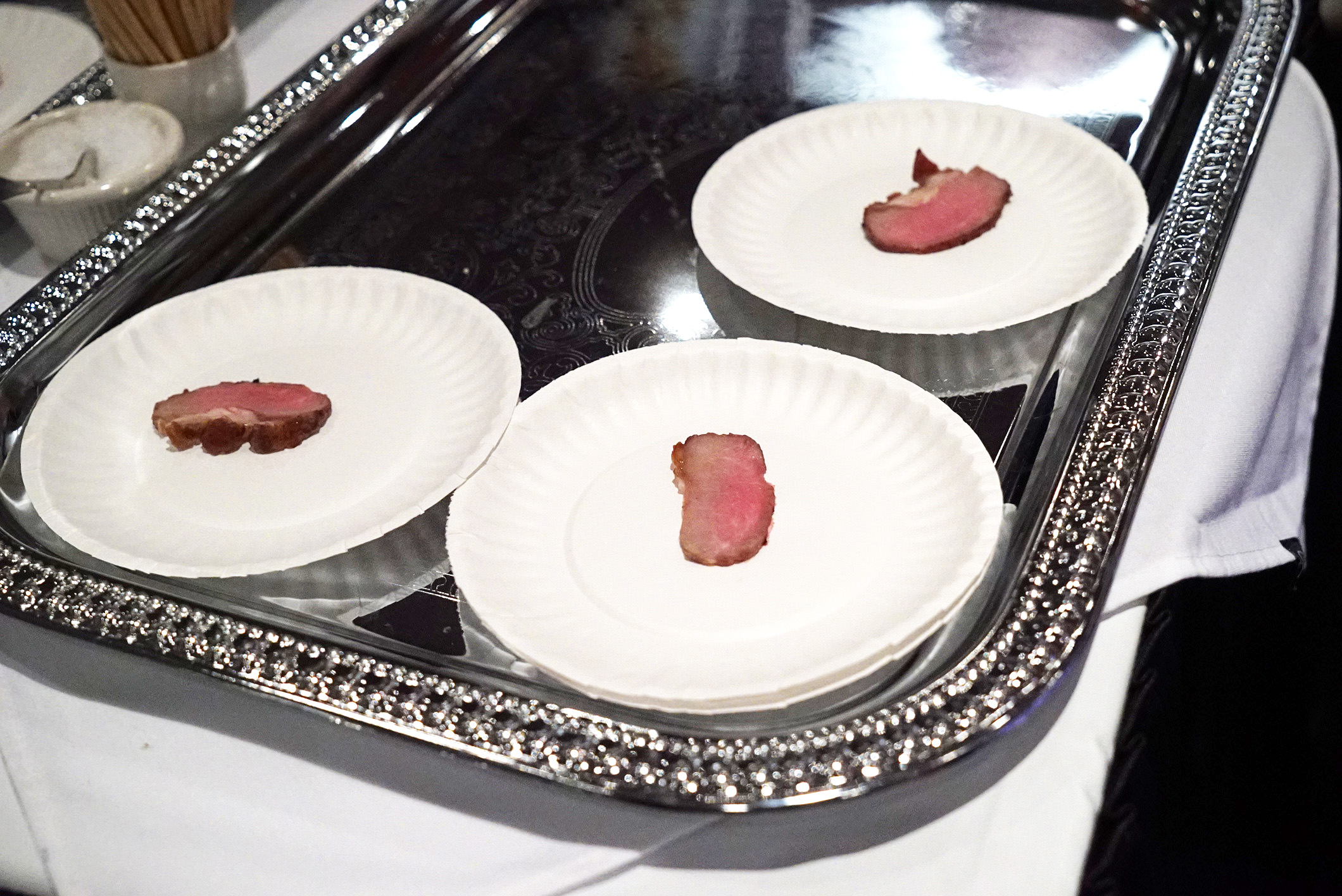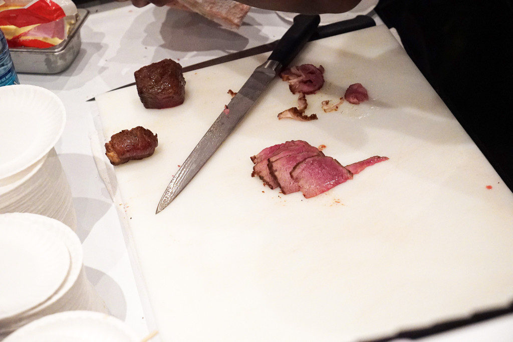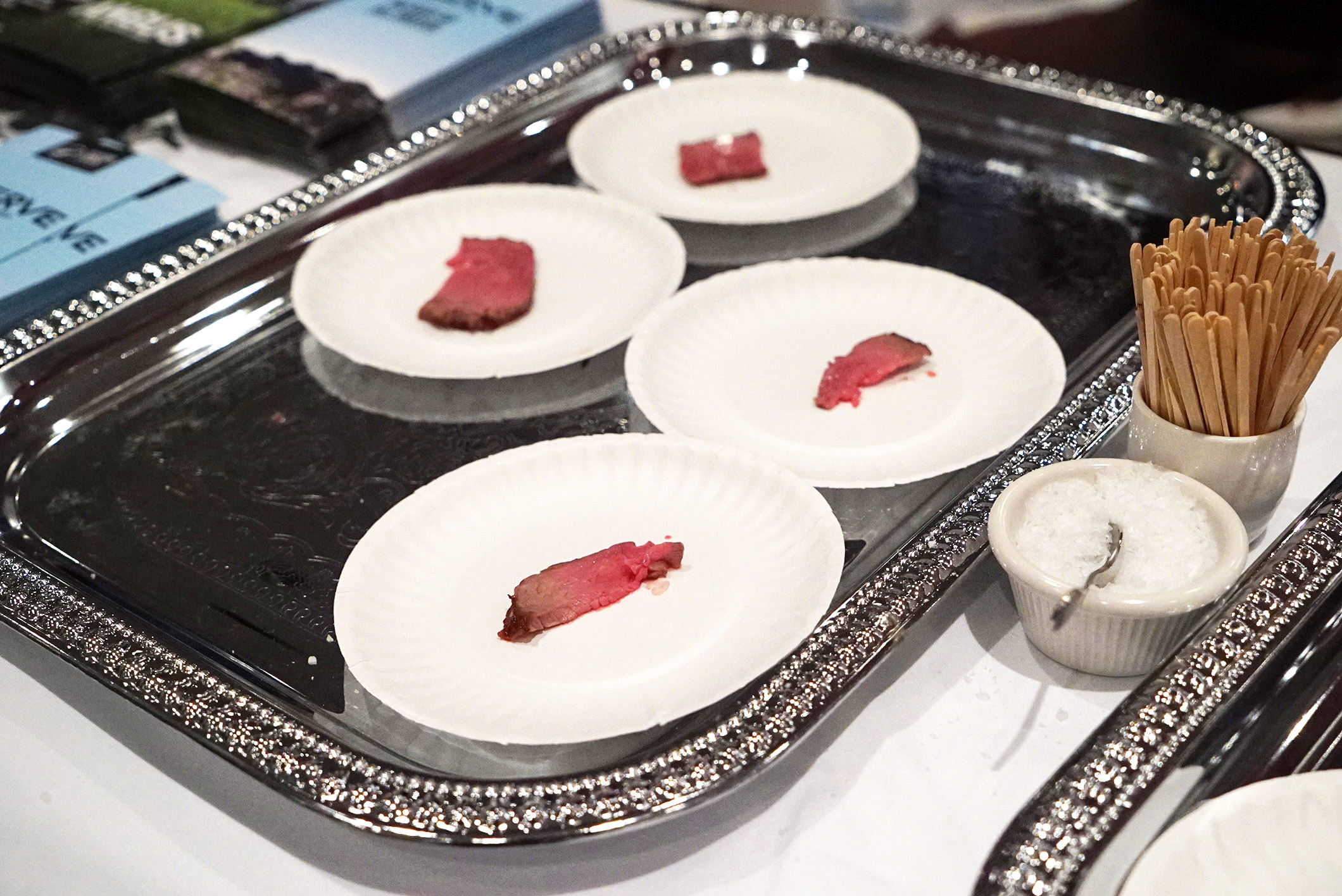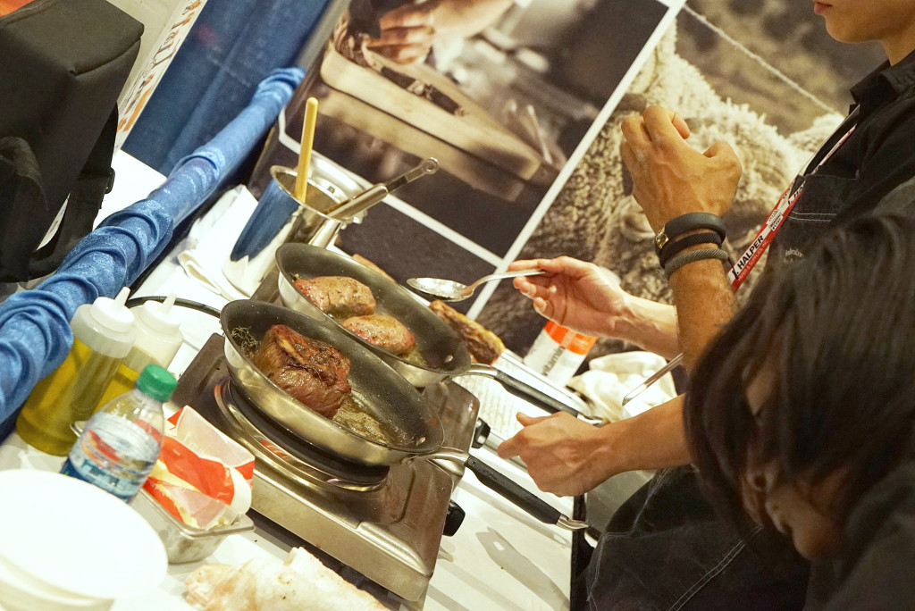 Okay here’s a little break out for some good shit. At the end of the Japanese pavilion we stumbled into these trays of perfectly pink meat. Veal, lamb, and beef, to be precise, all from New Zealand. All natural grazing, no hormones or fucked up shit happening. The stuff was delicious. Take a look: