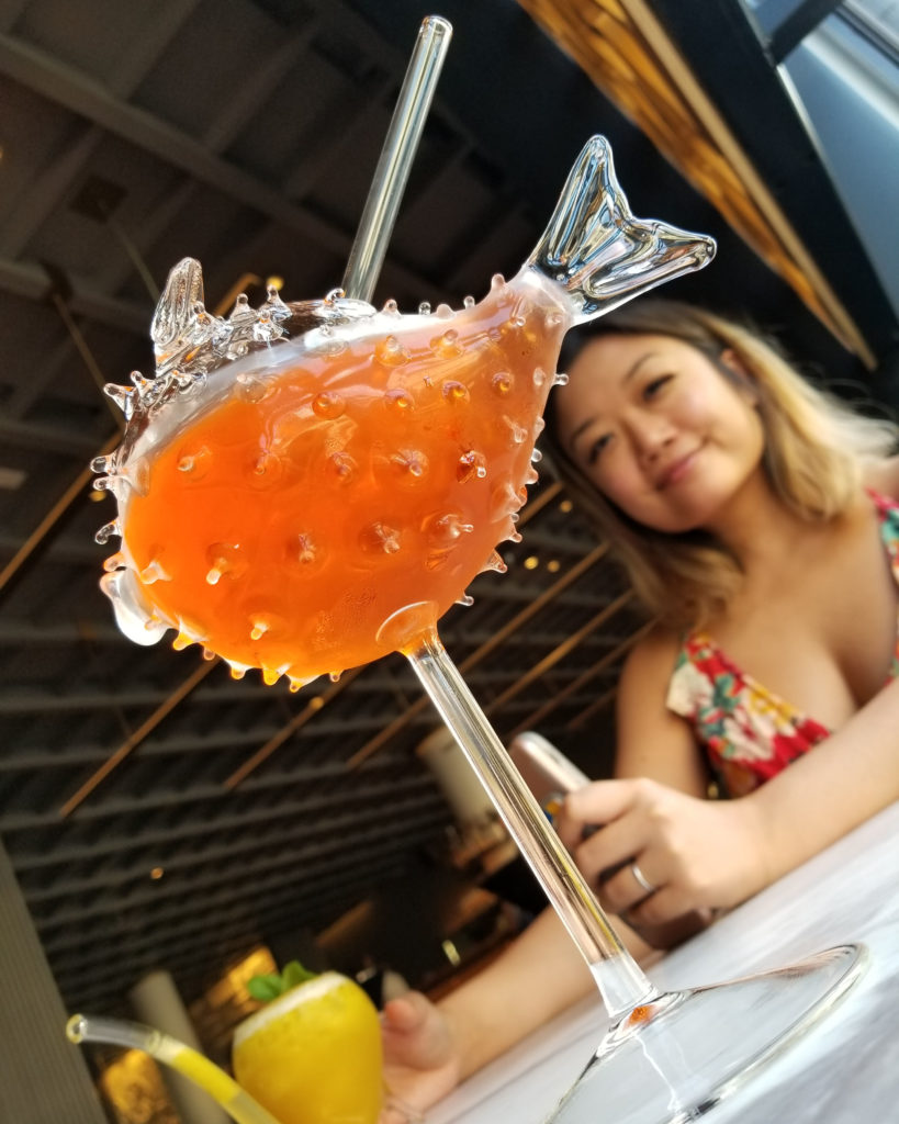This cocktail is like an Aperol spritz without the ice, and comes in a blowfish glass.