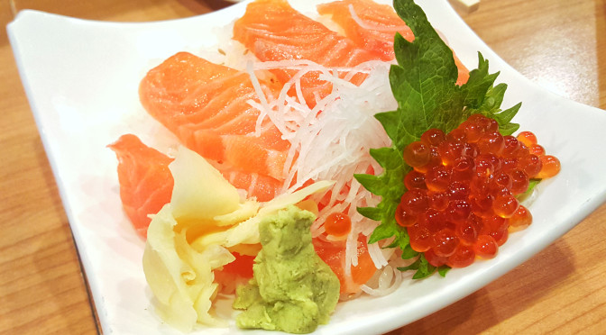 I ordered a small version of the all-salmon Chirashi bowl (Salmon Oyako Don), which had four pieces of salmon sashimi and a good blob of briny and savory salmon roe. The sushi rice beneath was surprisingly tasty, and was topped with a good amount of fresh wasabi, ginger and sesame seeds.