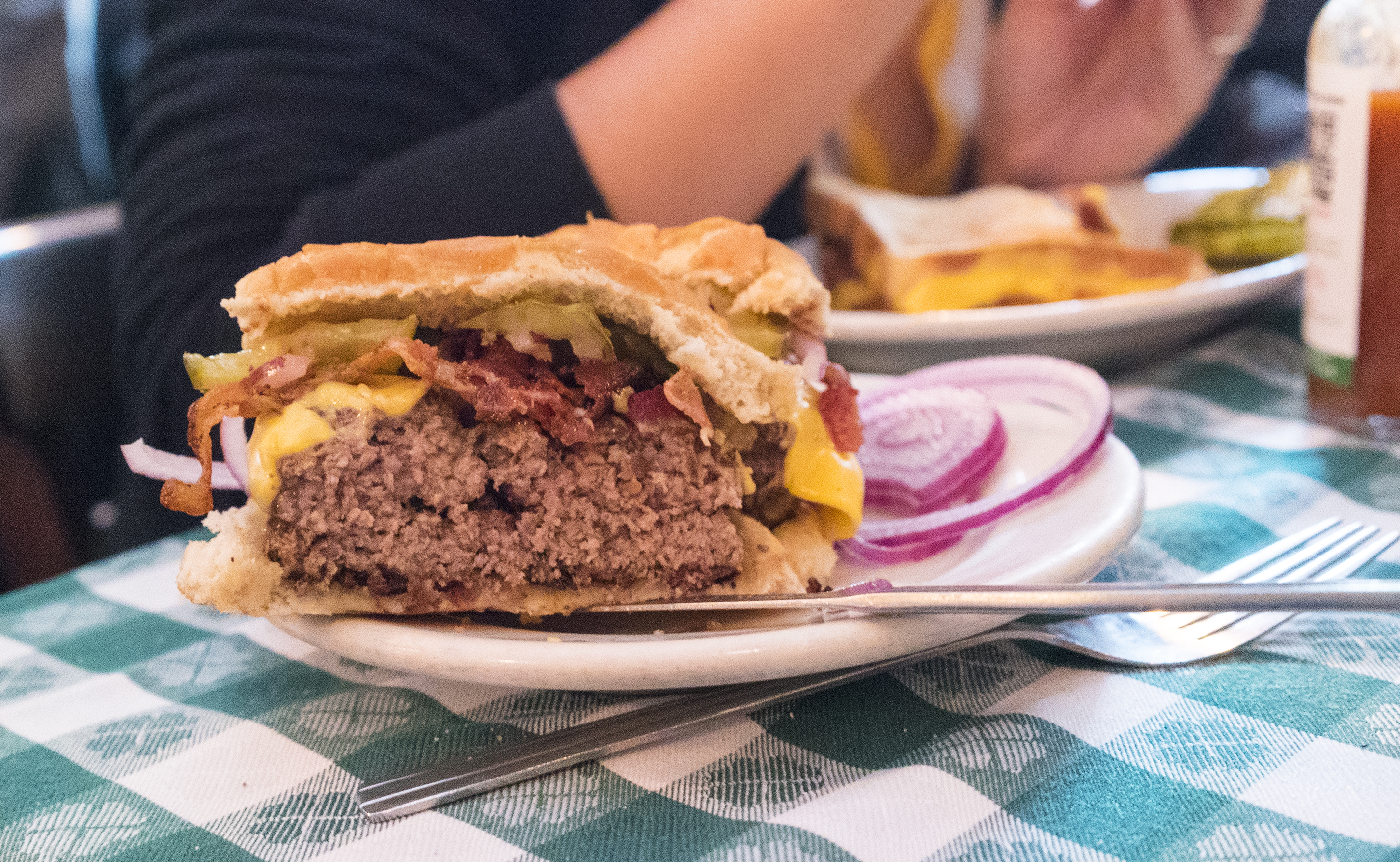 Great bun – they stick to the potato bun which holds up under intense scrutiny. Bacon was crispy, and cheese was yellow and American, just how I like it.