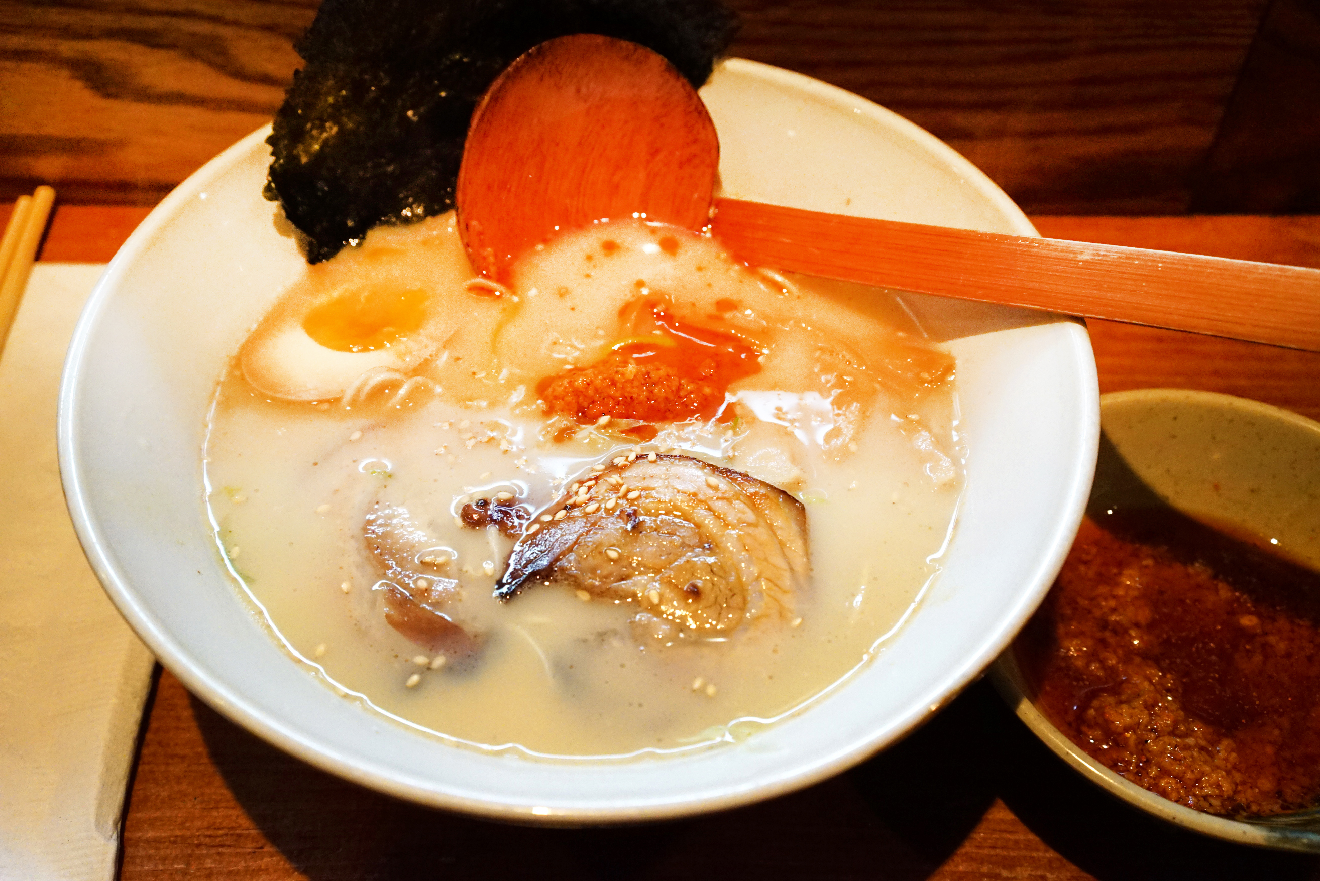 It was pretty good. I had the tonkotsu broth with the spicy shit on the side. Noodles were a little over cooked, but the components and broth were all pretty good. Even with just a little bit of the spicy blob, this thing packed some kick. The spicy paste is also rich with a fermented garlic flavor as well. I’ve had better, softer meat in other places, and some of the mushrooms were a bit chewy, but otherwise I did enjoy it.