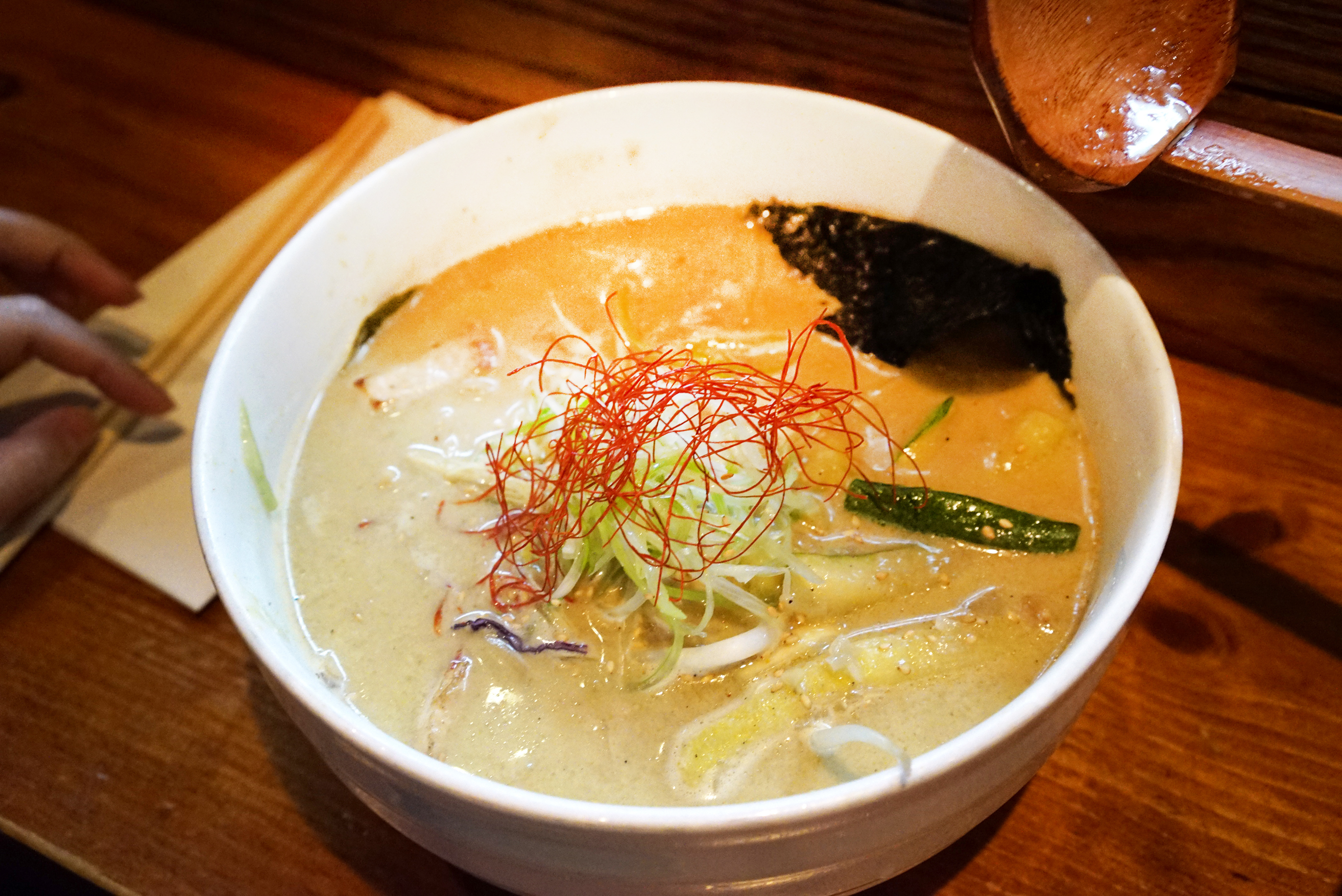 My wife had the green curry coconut chicken ramen, which was really nice. Different, spicy, and lots of flavor: