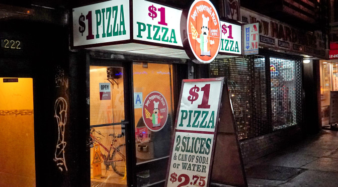 This is a no-nonsense category 3 dollar slice joint down on 1st Avenue just below the 14th street L station. Doughy yet crispy crust, quality melty yet crisp cheese, and a good sweet sauce. Fucking hits the spot. I easily put this slice down after a full meal (dessert included) at a nearby French bistro. Great little slice.