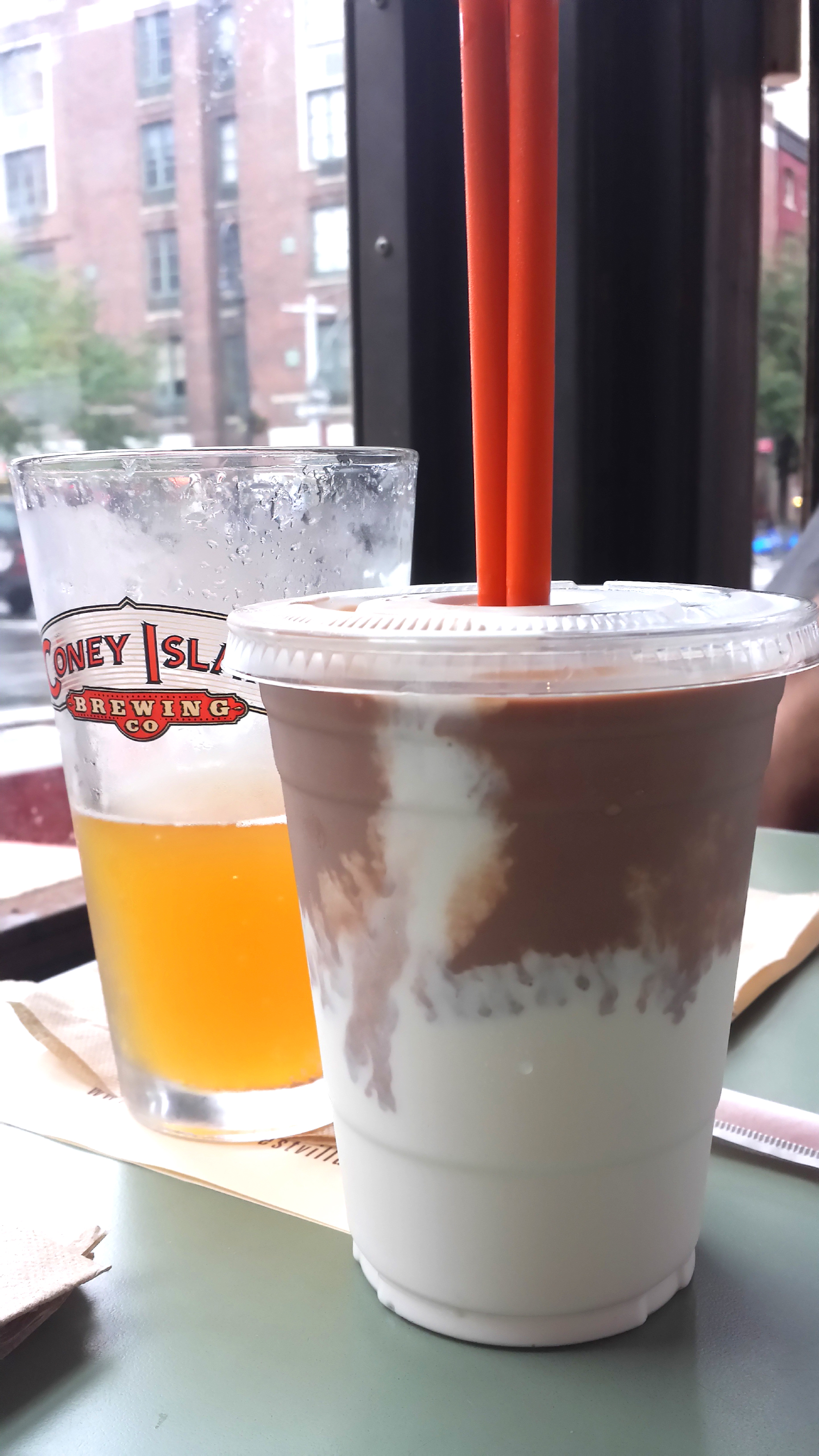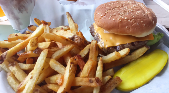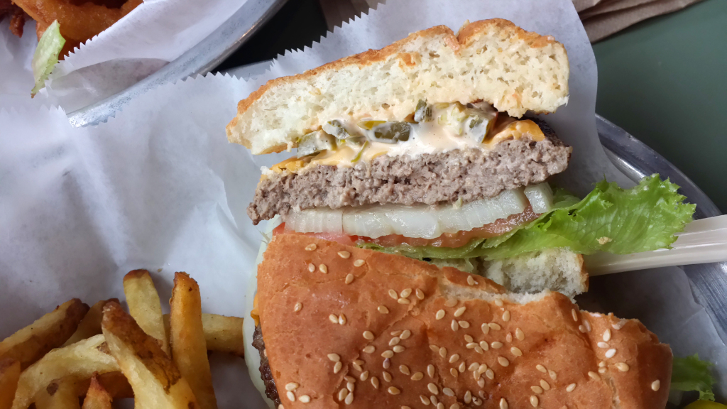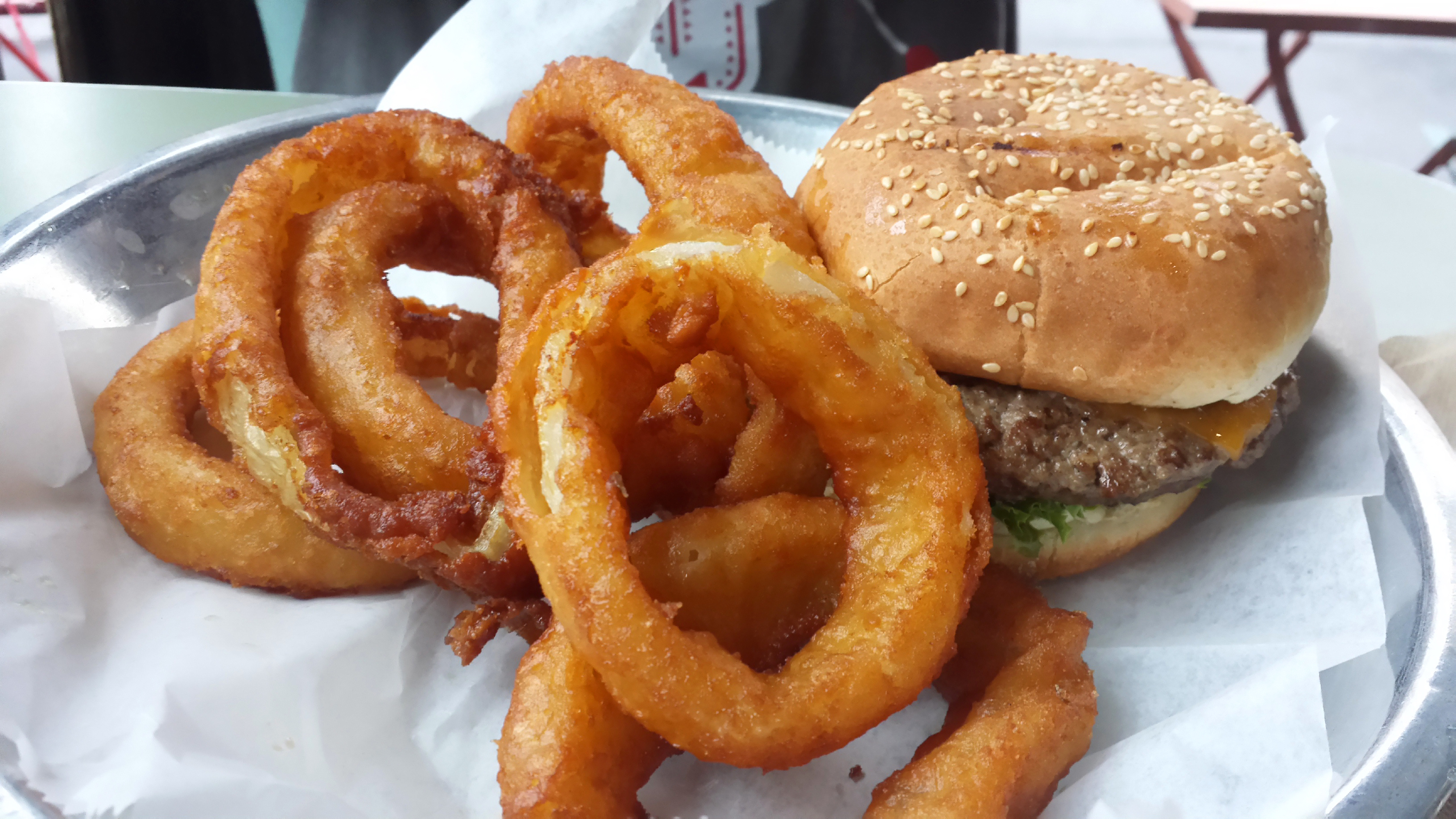 I had a “midi” (5oz) burger with American cheese, jalapeño peppers, lettuce, onion, tomato and spicy mayo. Shit was good, but the burger was a little beyond medium. Thank God for melty cheese. Fries were better than mediocre – good seasoning but not as crispy as I like. Onion rings were delicious, and the shake was killer (B&W, bitch).