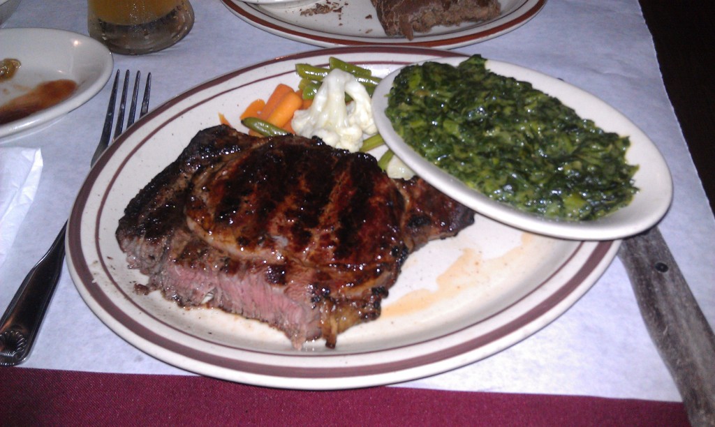 J&R steaks come with a soup/salad and a side. I had a salad with blue cheese – nothing fancy, but it did the job. For my side I picked the creamed spinach, which was creamy but lacked character. The steak dinners also come with a little bit of steamed veggies on the plate (cauliflower, carrots, and beans). We skipped apps and desserts.