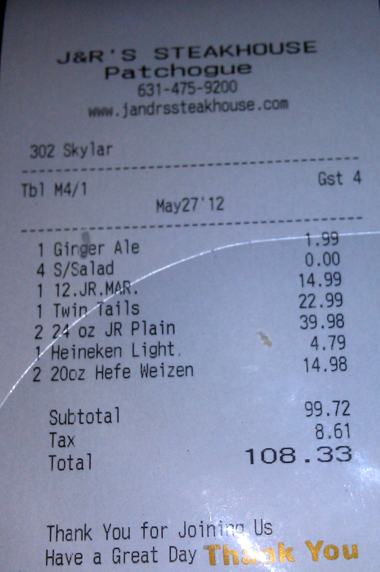 Again same as J&R in Islip. The bill for four meals was $108. Half the price of Murtha’s and a quarter the price of the big boys in NYC.