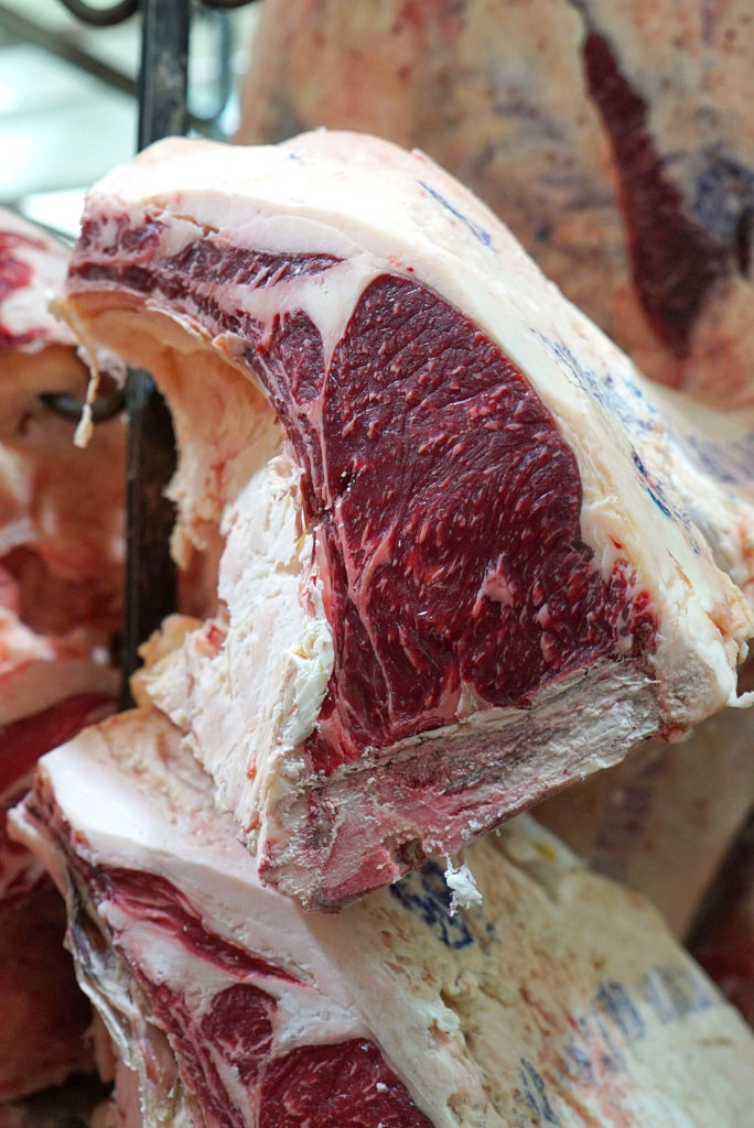 Both short loins had been aged for eight days at the time. The one on the right was cut by King Somolon’s butchers directly from a fresh carcass, right there on premises. The one on the left is boxed beef. Boxed beef comes off the fabrication floor at slaughterhouses and is then sealed up in bags and sent out to distributors in boxes. Distributors then break the beef down further depending on what their customers want (restaurants, delis, catering halls, etc). The difference in color and fat quality is staggering. The fresh beef will have a much better flavor from the aging process. But I was blown away by how dark and aged it looked after just eight days.