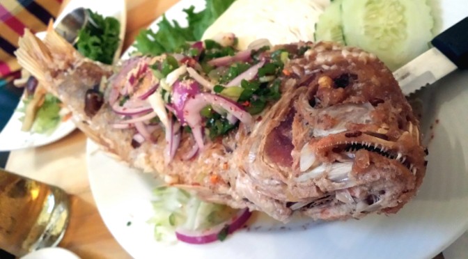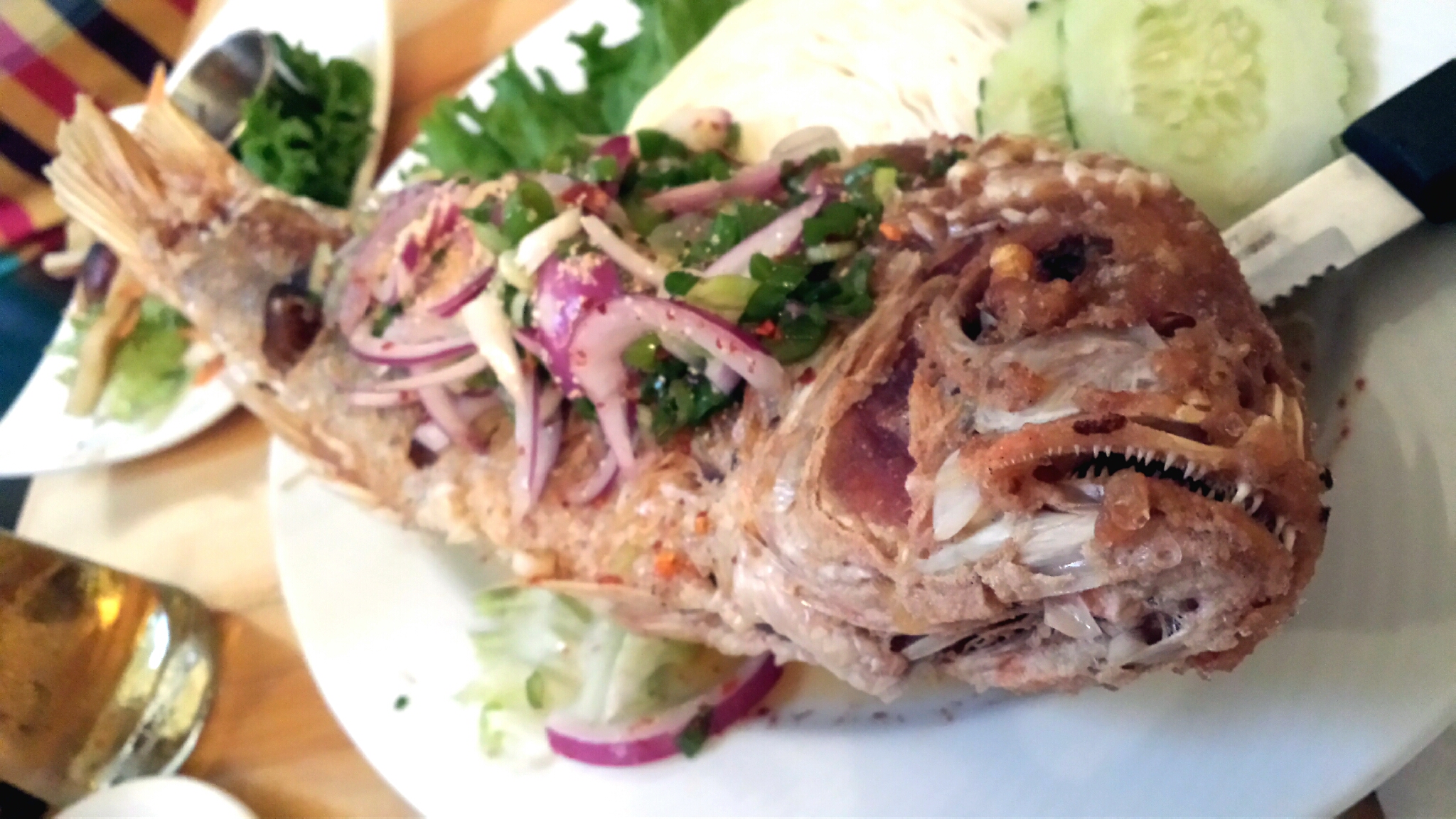 My wife ordered the red snapper for her entrée (larb pla kra pong). Unbelievable presentation. It was a gorgeous full fish, fried crispy with scallions, chili, onion and herbs. The skin was so crispy that it reminded us of baked chicken wing skin. So tasty.
