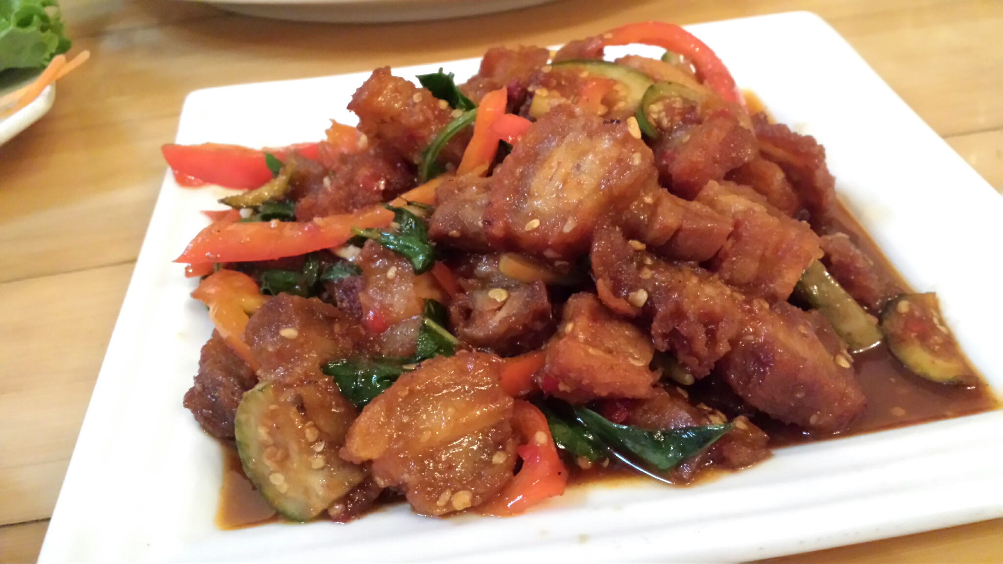 I had the crispy pork with Thai eggplant (pad ped moo krob). The pork was belly meat, and was like thick chunks of spicy bacon candy. So fucking good. And this was a steer in the right direction, by the way. Our waitress pointed us to the jewels of this place when she realized what we were after as we ordered: crispy duck, crispy pork. Initially I was going to order duck stew with Chinese broccoli (broccolini) for my entrée and pork larb to start, but she pointed me to the larb duck and this pork dish instead. Well done. This was great, especially with the sticky rice that we ordered on the side.