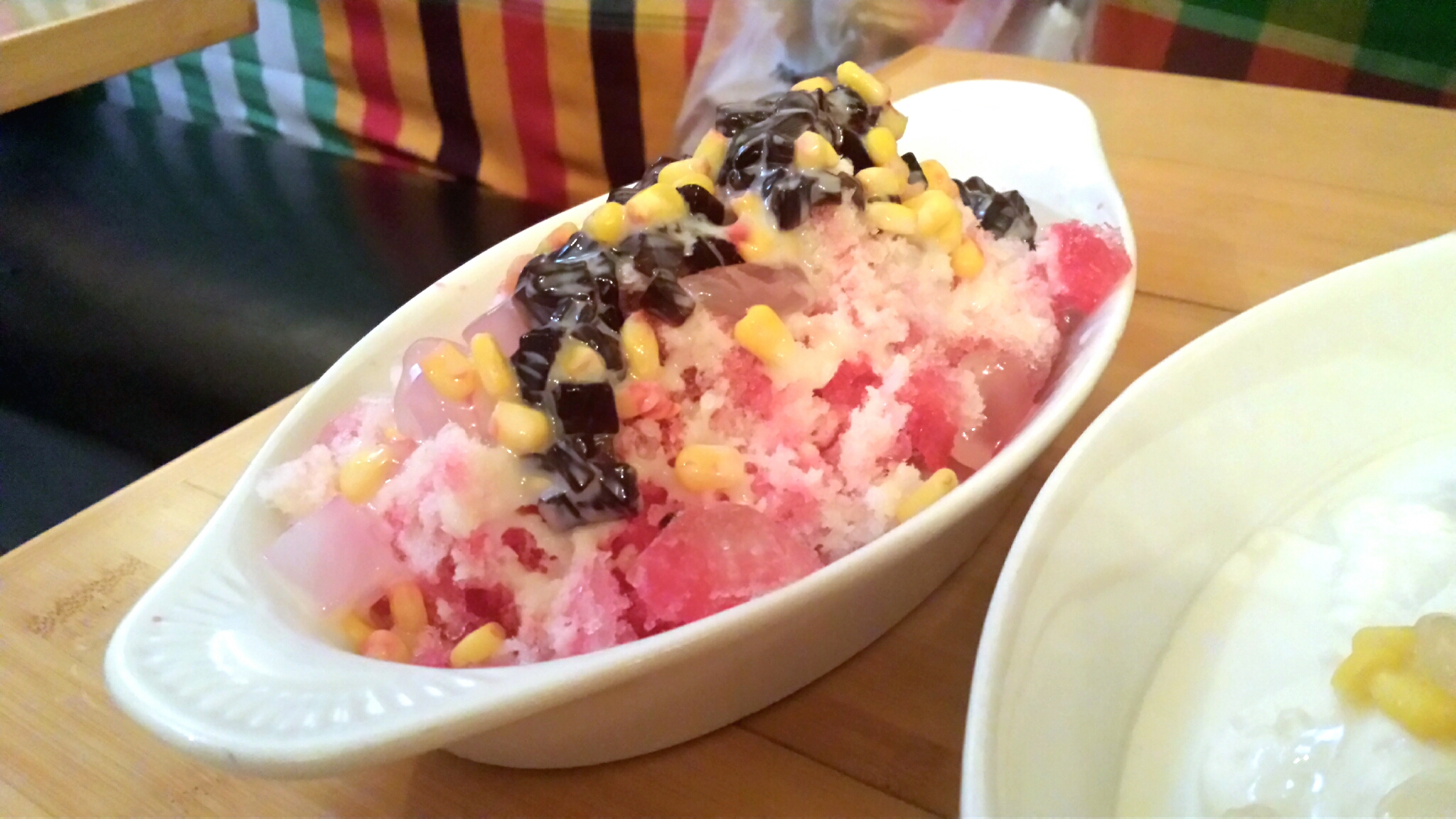 For dessert we tried coconut ice cream and Thai shaved ice. Both were garnished with corn kernels and sweet gelatins. The shaved ice reminded us of the dessert drinks in Vietnamese cuisine, only more solid. However the strawberry bubblegum-esque sort of flavoring was a bit off to us, but it was still refreshing and contrasted nicely after all the salty and spicy food we just ate. The coconut ice cream was smooth and creamy, and had coconut shavings in it.