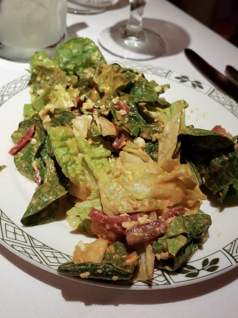 The spinning salad is called that because they spin a cold metal bowl which tossing it. Romaine lettuce, sliced beets and a thousand island style dressing. Very classic.