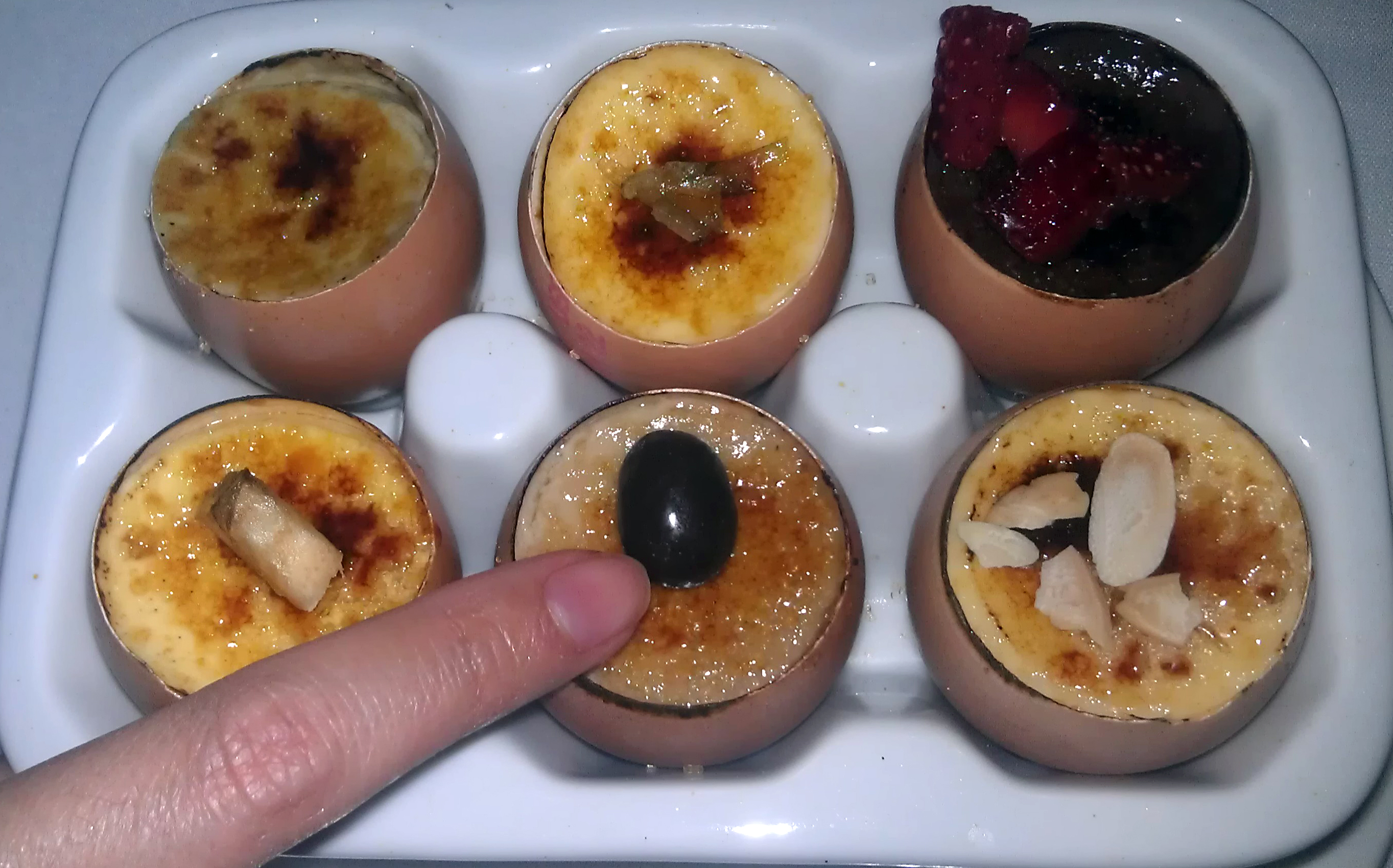 First, an order of east coast oysters (6) – blue island and malpeque. They were delicious. There were one or two shell shards, but nothing to deduct points over. Next we had a sea scallop appetizer and the plate of blood sausage and sweet breads. The scallops were on the small side. There were two on the plate for about $16, and they were half the side that a normal scallop should be. They were closer to bay size than sea size, if you catch my drift. They were also a bit overcooked, which was a shame. The hints of fennel were nice, and otherwise they tasted great. The sweet breads were crisp outside and creamy inside. A little buttery, but I didn’t mind so much. The blood sausage was nice and mild in flavor but small in portion size. However there was a nice “stuffing” that accompanied the items to make up for it. On the side we had creamed spinach and the “signature balls.” Sounds delicious, right? PICK A NEW NAME FOR THE BALLS M&P! The spinach was a bit watery and not so creamy, but the lack of cream was not unwelcome considering how rich everything else was in the meal. The balls were essentially potato hush puppies, supposedly filled with cheese, though I didn’t get much of that flavor inside. They definitely tasted like chive though – they were just mediocre. For dessert we had a variety of creme brulees. There were six flavors (chocolate, key lime, banana, almond, coffee and vanilla). They were neatly served inside empty egg shells in a porcelain egg holder. Very cool, and a bonus point on plating! It was fun to taste them all.
