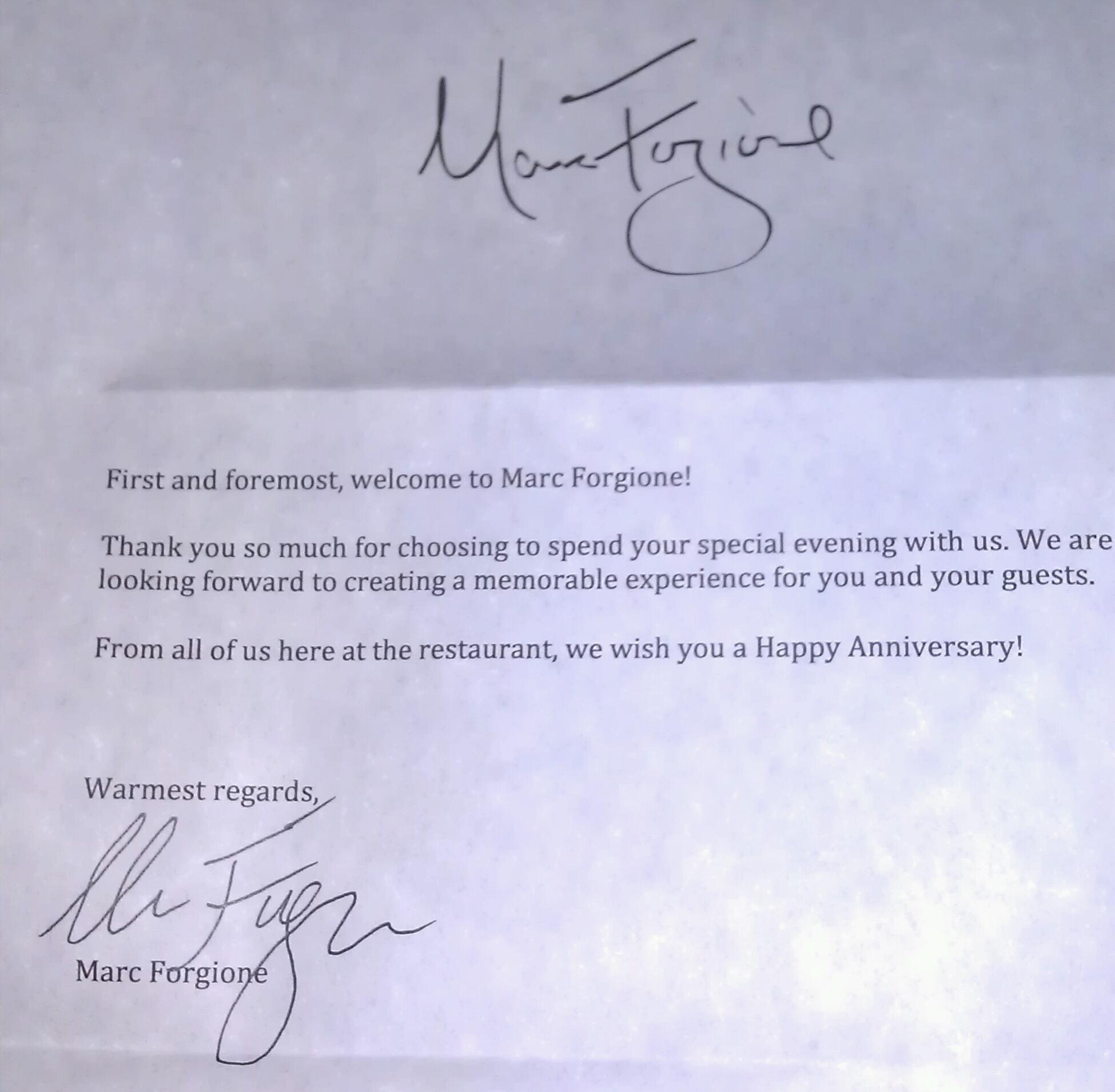 It was a heavy meal, and would’ve been heavier if we started off with the fois gras instead of the octopus. The waiter, Jason, was helpful in making sure we didn’t have a richness blowout when he suggested we go with the octopus based on the other stuff we were ordering. He was great by the way. So were the cocktails. The service here in general is fantastic (definitely a 10). We even had a personalized “Welcome” / “Happy Anniversary” letter signed by Marc sitting at our table when we were seated, and at the end of the meal we had the pleasure of getting a glimpse of the culinary genius before we left.