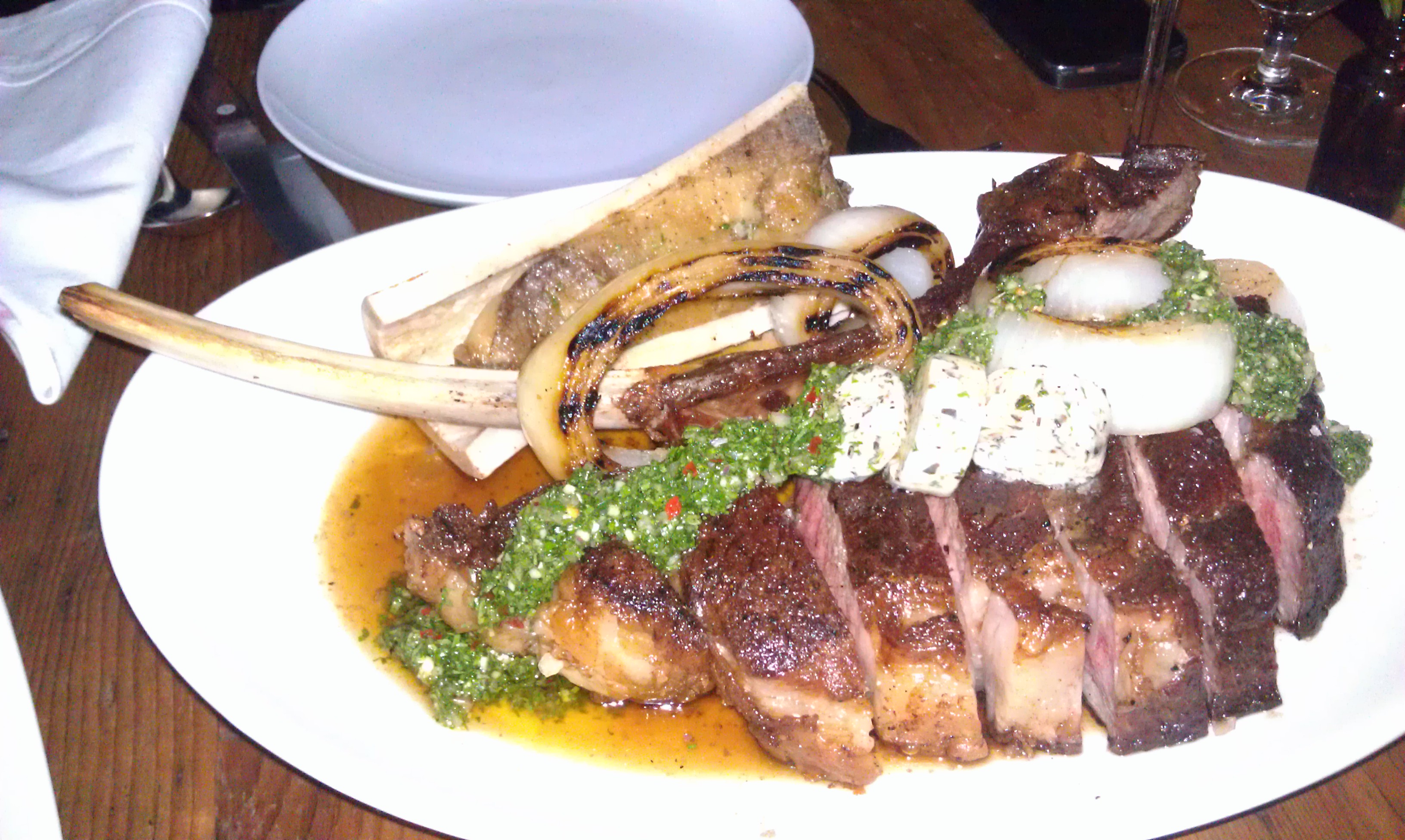 As you can see in this shot it came with side items (a composed dish, as they say): carrot juice glazed carrot, some roasted potatoes, and roasted bone marrow. The steak itself was topped with a chimichurri sauce and little blobs of cold rosemary butter, which was nice because it didn’t melt into the meat and drench the plate in butter. You could pluck them off and spread it to your liking.