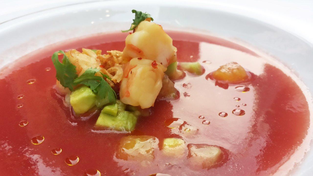 Next was the star of the show. A watermelon & tomato gazpacho, with avocado, pickled shrimp, and crispy shallots. Spicy, cool, refreshing, and delicious.