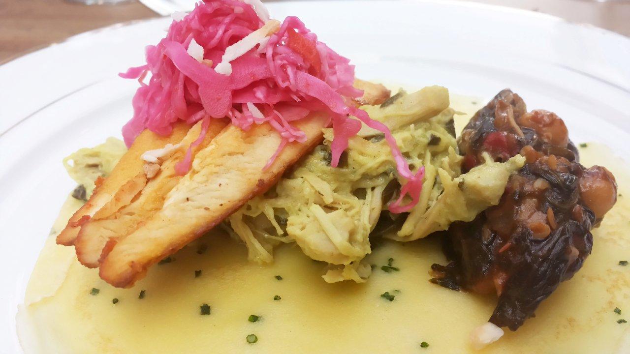 The final savory dish was lime coconut curried chicken, atop a Swedish pancake, and served with collard greens. The pulled chicken aspect was much better than the sliced breast part. It was very Indian in flavor. The collard greens were okay but something in the texture was a bit off putting. Maybe there was some eggplant in it? Not sure. I still ate every fucking bite though.
