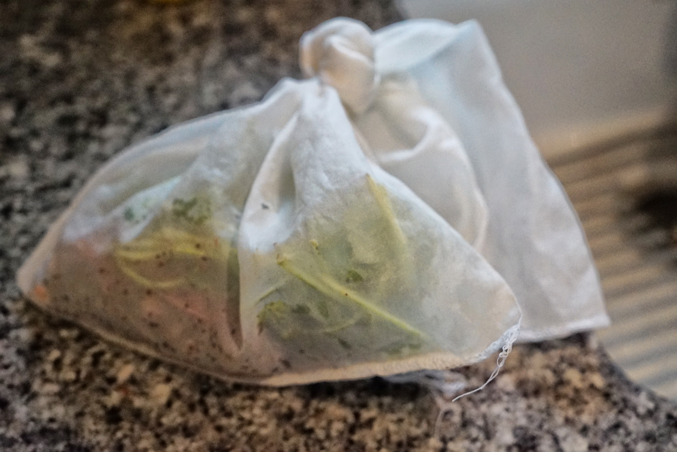 Pour the hot honey water over your bag of spices, which you should secure in a straining bag, and into a primary fermenting container (usually a bucket that you can later secure with an air lock).