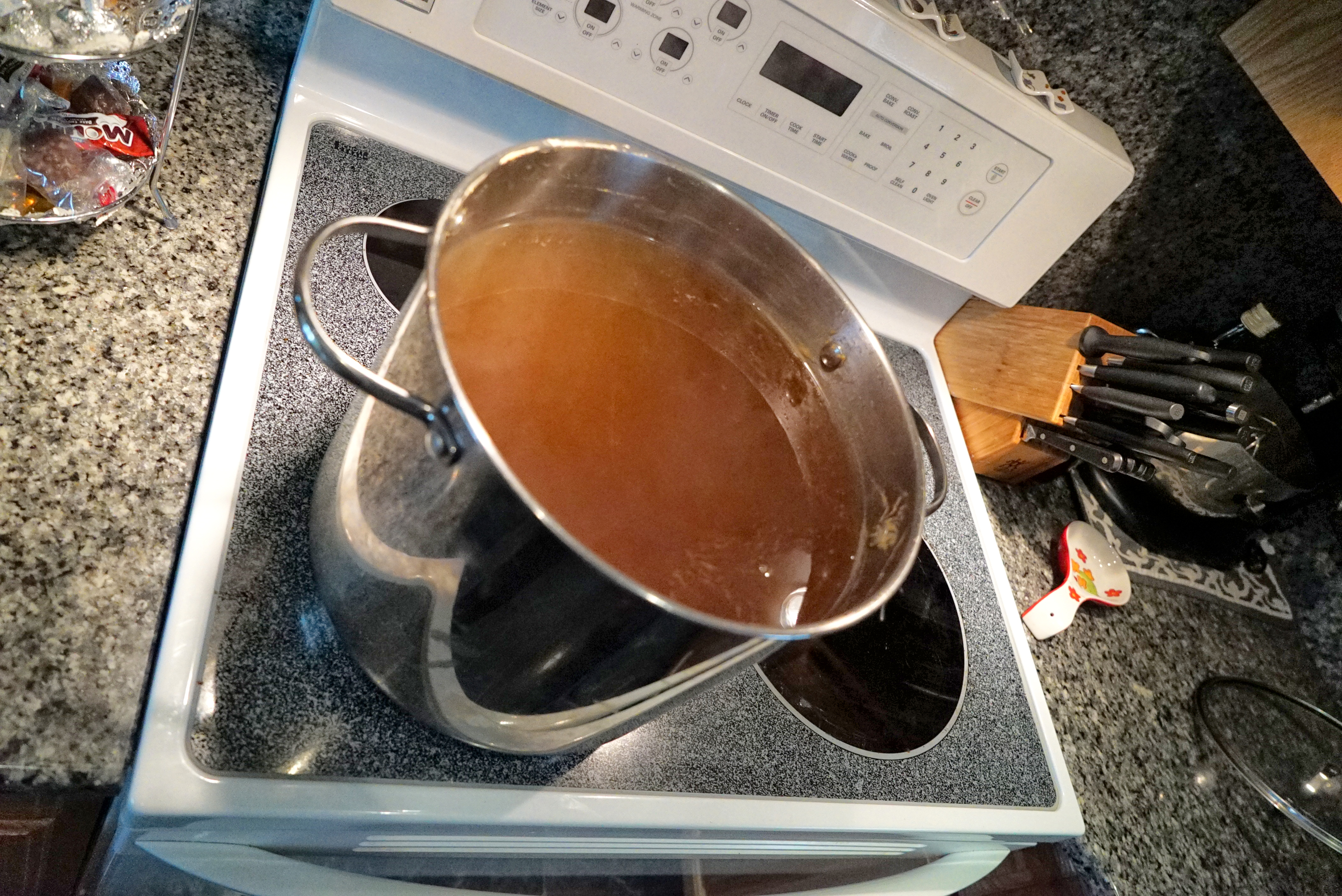 First, you boil some water. Then you add the honey into the desired amount of water, skimming off any white scum that forms at the top of the liquid as you go. Since I was going for strong and sweet, I dissolved the honey into three gallons of water (total amount, after honey was added), but you could probably use a ratio of two or two and a half pounds per gallon if you want. Boil for about 30 minutes and then let the liquid cool down so it is no longer boiling/bubbling.