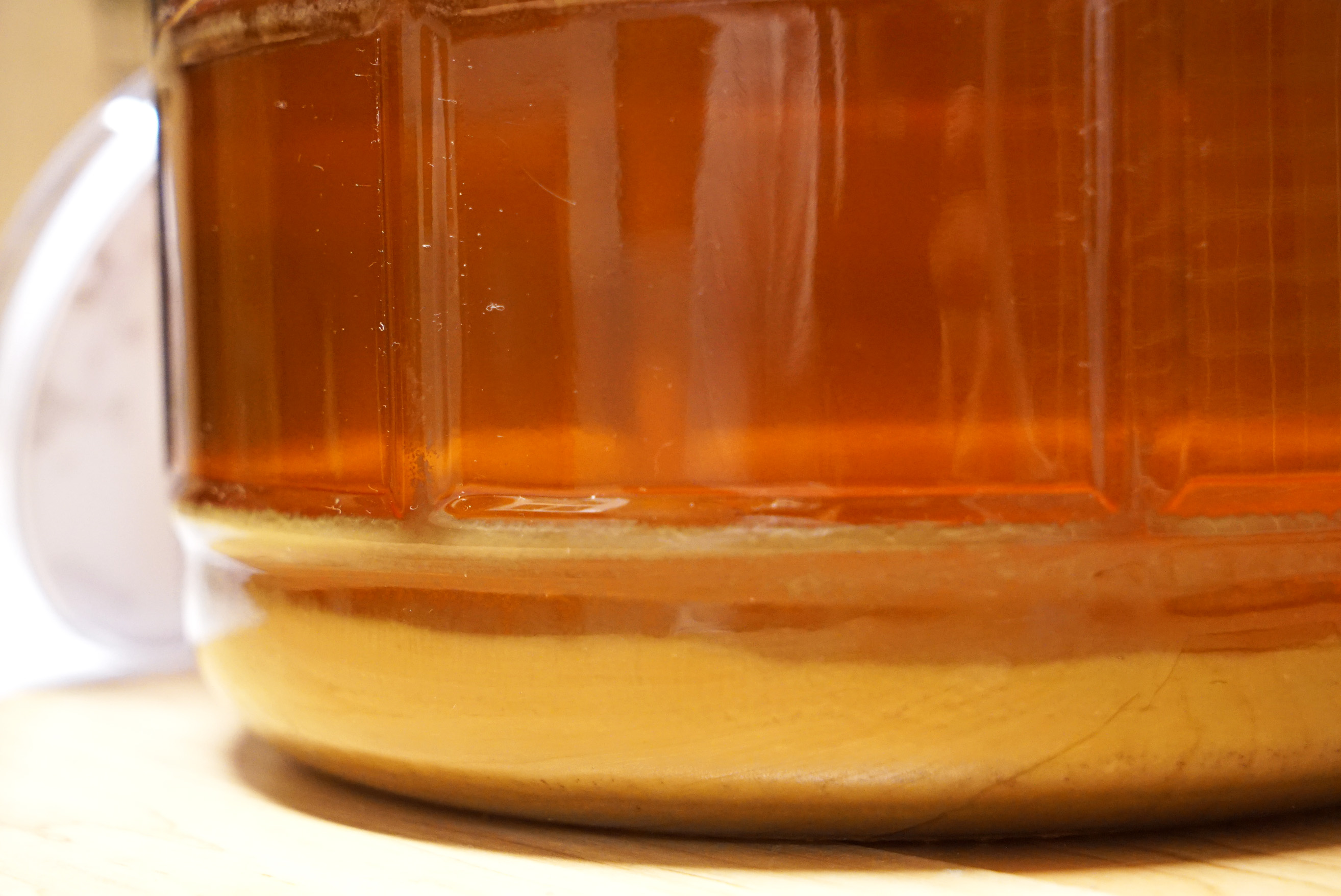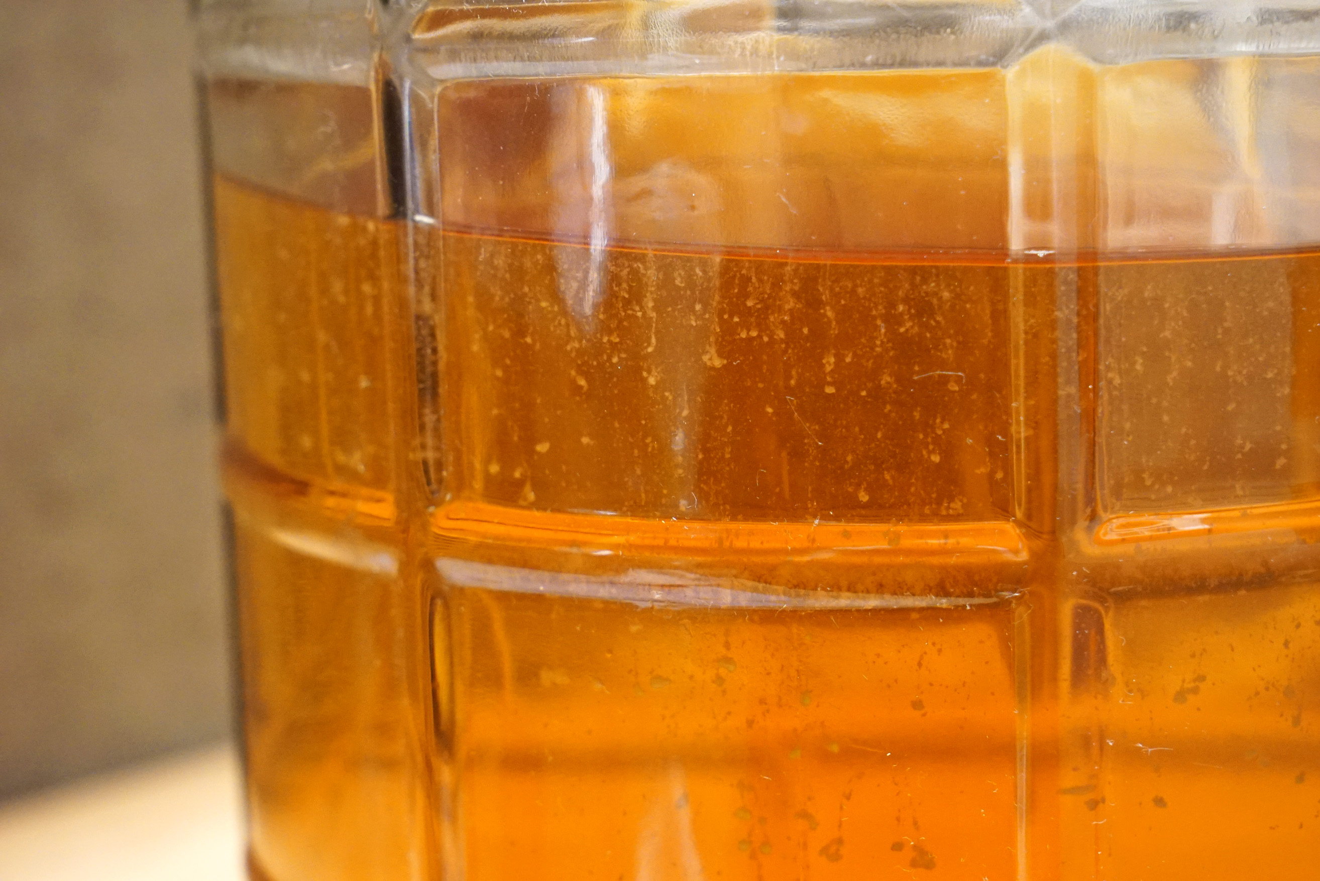 The liquid was once sticky to the touch, due to the sugar content. All that sugar has now turned into alcohol. The mead is strong, sweet, and comforting.