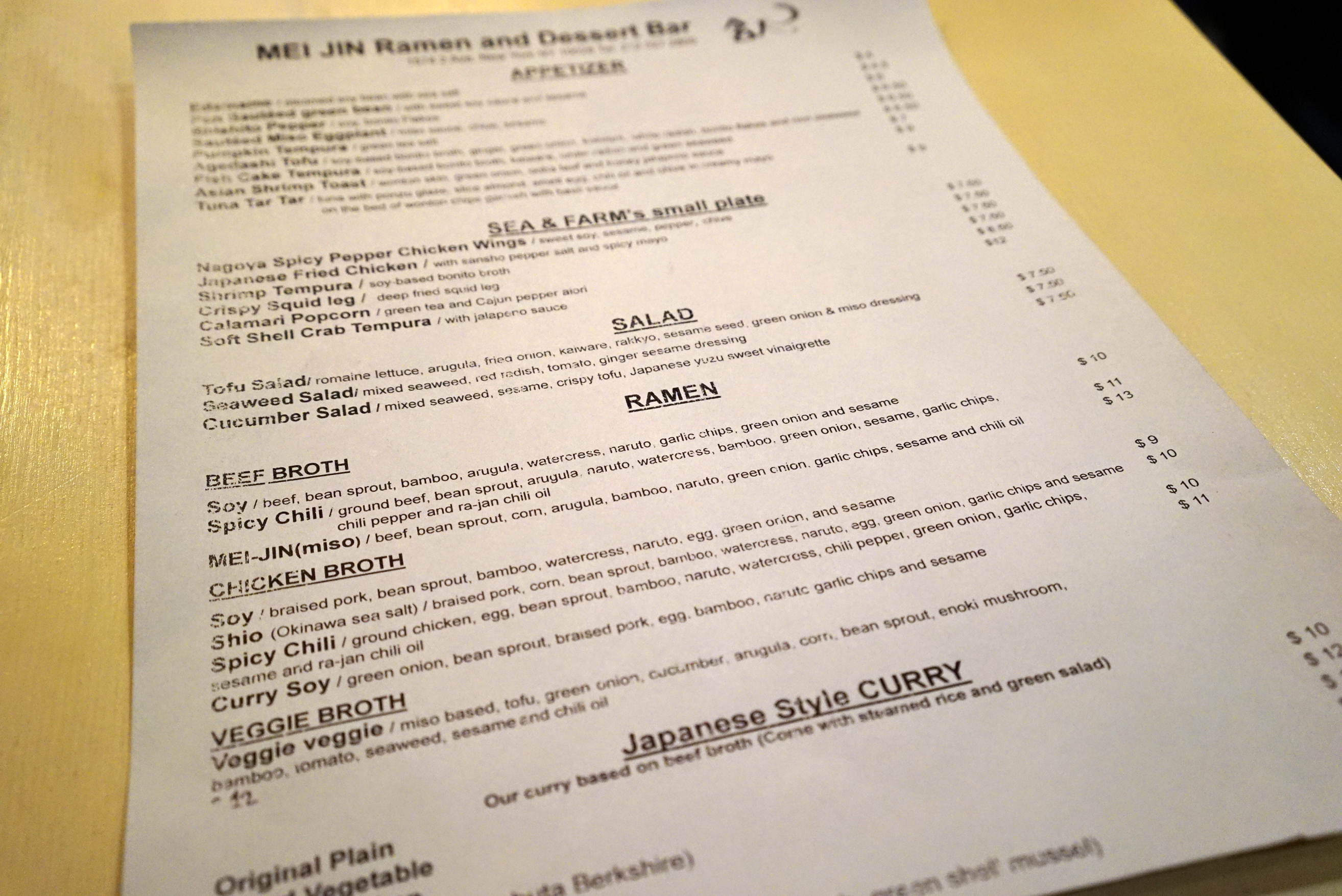 I saw a write-up about this joint that mentioned their beef broth. Beef broth seems to be a pretty rare item in the NYC ramen world. I only know of three (and a half) places that offer it: Takashi (midnight ramen), Ganso (which I have not tried yet), Kung Fu Little Steamed Buns Ramen (this is the half mark, because it is technically not ramen), and this joint, Mei-Jin.