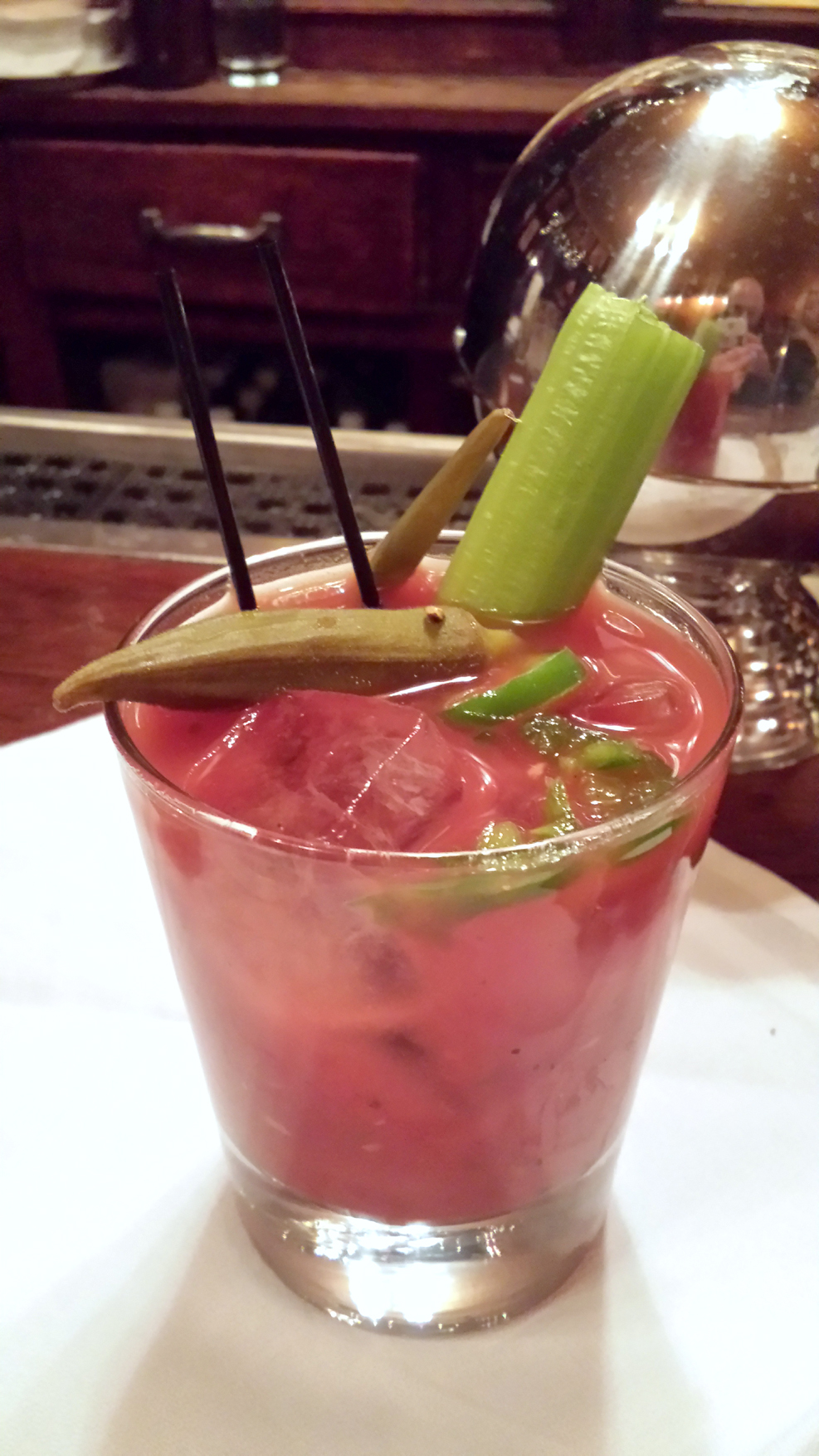 My wife had a spicy bloody Mary with jalapeños, southwest spices, pickled okra, celery, and pickled green bean. It tasted very fresh.