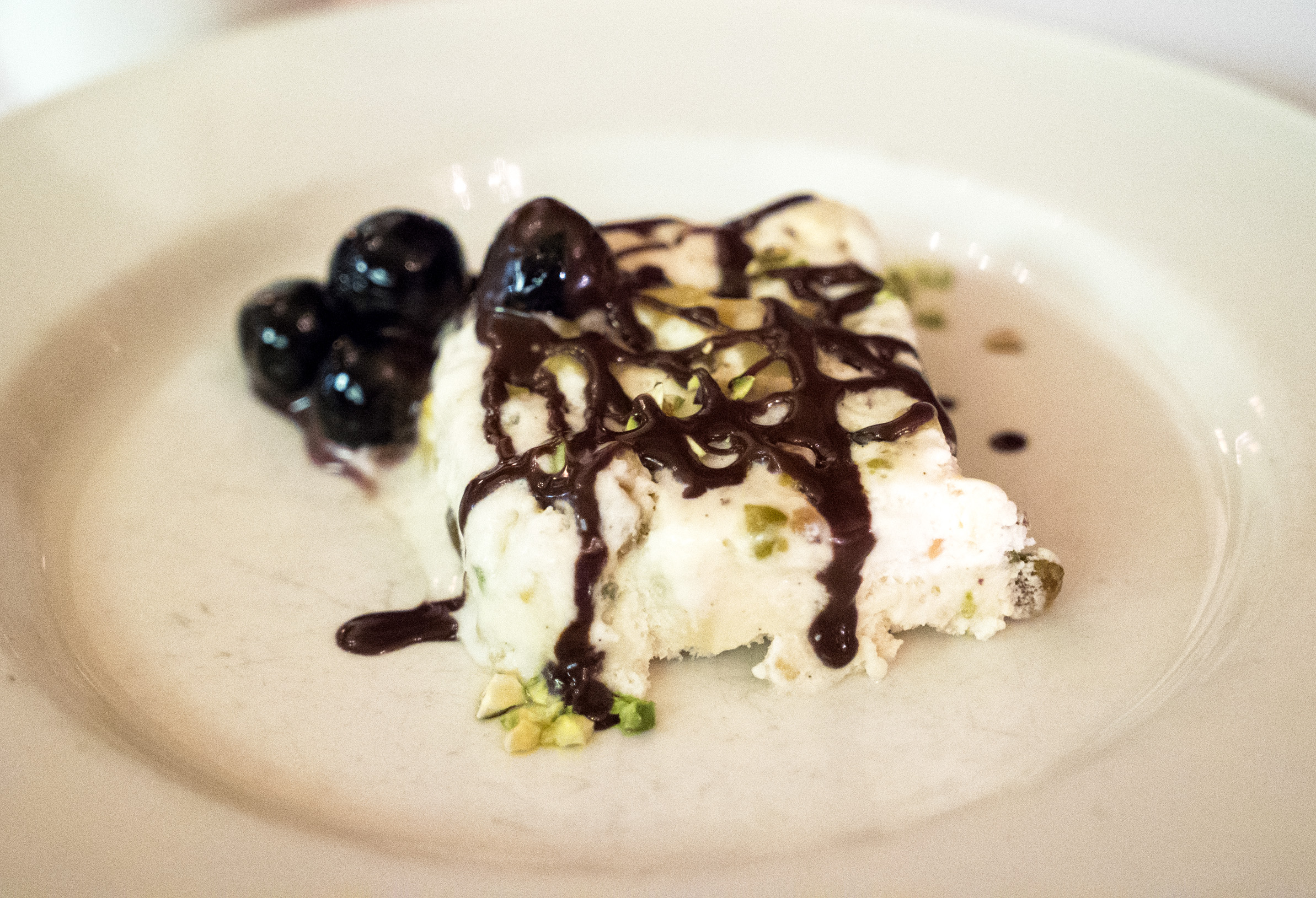 For dessert we tried the cold nougat ice cream pie thingy. It was really nice, almost marshmallowy in texture on top, and with the flavor of a cold candy bar on the bottom. It was topped with a chocolate cherry sauce and some crushed pistachios.