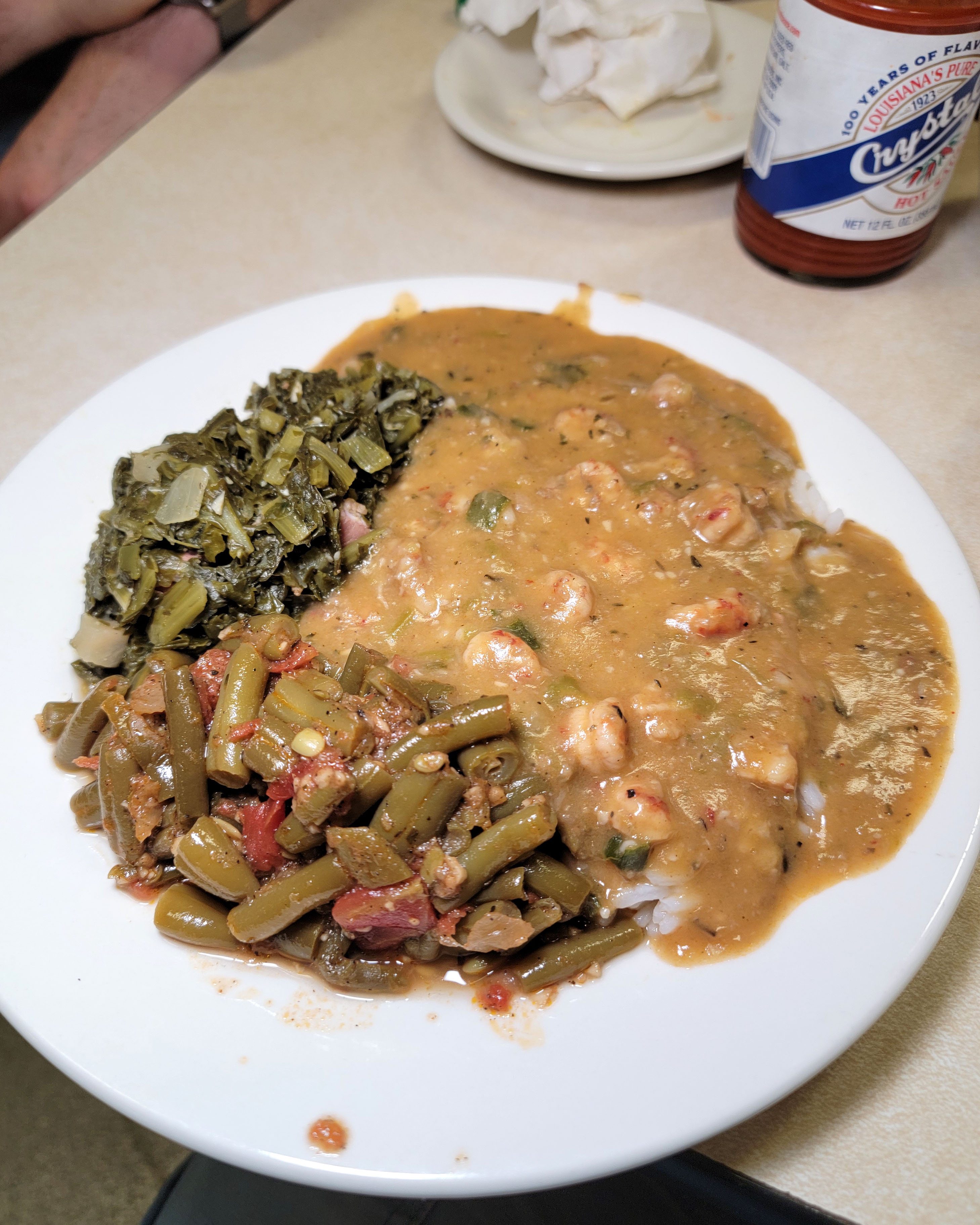 The waitress came over and gave us this plate of collared greens, shrimp etouffee and green beans. Someone had ordered it and left, or they made an extra by mistake.