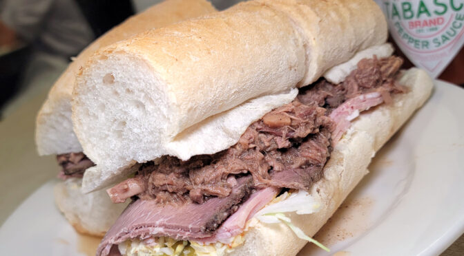 They’re known for their po’ bouys, so I had to try the Famous Ferdi special: a po’ boy packed with baked ham, roast beef, debris and gravy, served dressed.