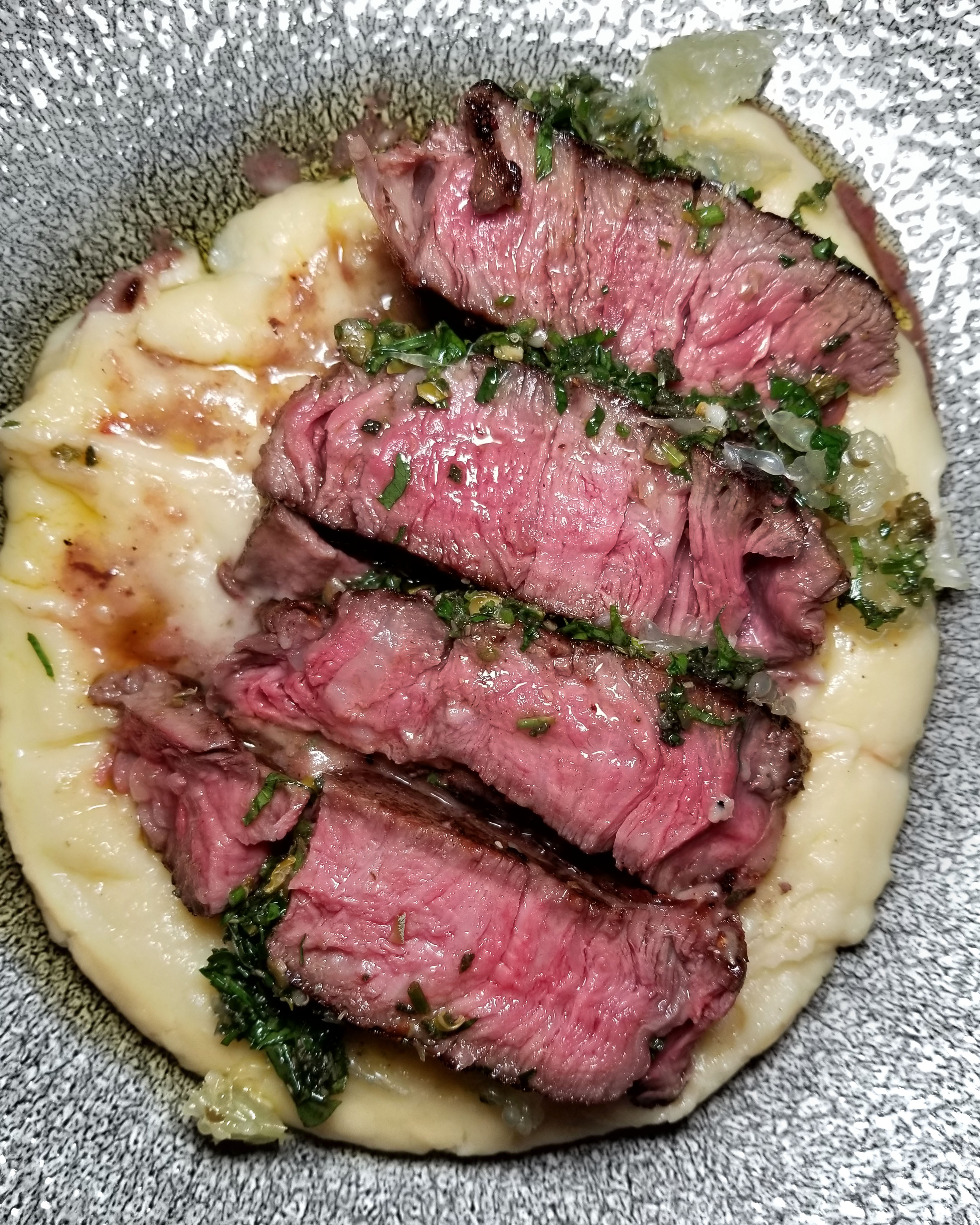 A neatly presented pinwheel of spinals dorsi muscle (the delicious outer “fat cap” of the rib eye) with chimichurri sauce awaits you at Bowery Meat Company.