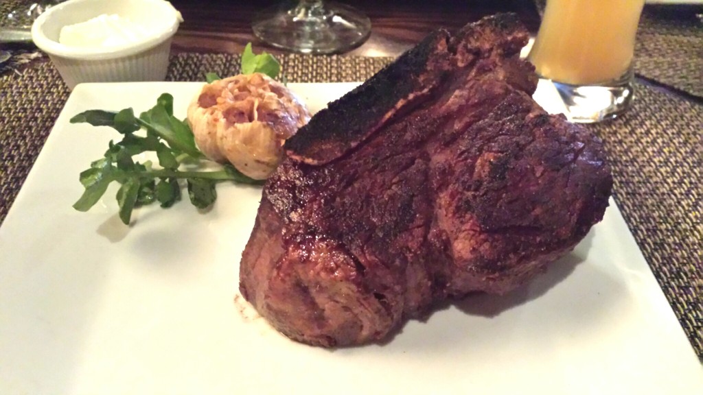 The steak tasted great. I ordered the gotham ribeye, a bone-in 22oz cut that tasted like a prime rib that kissed the grill. It was juicy like a roast, and had a little crisp going (more would have been nice). Great taste but one point off for missing the mark with not enough crisp and a bit more non-chewable gristle than I like to see. They let it rest just the right amount of time, so there was no blood loss and it stayed very juicy.