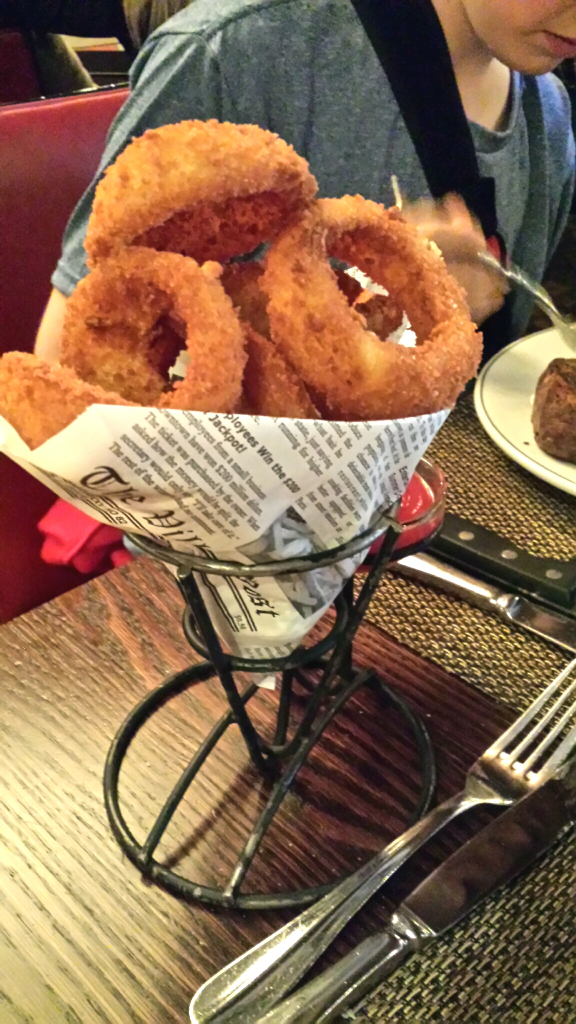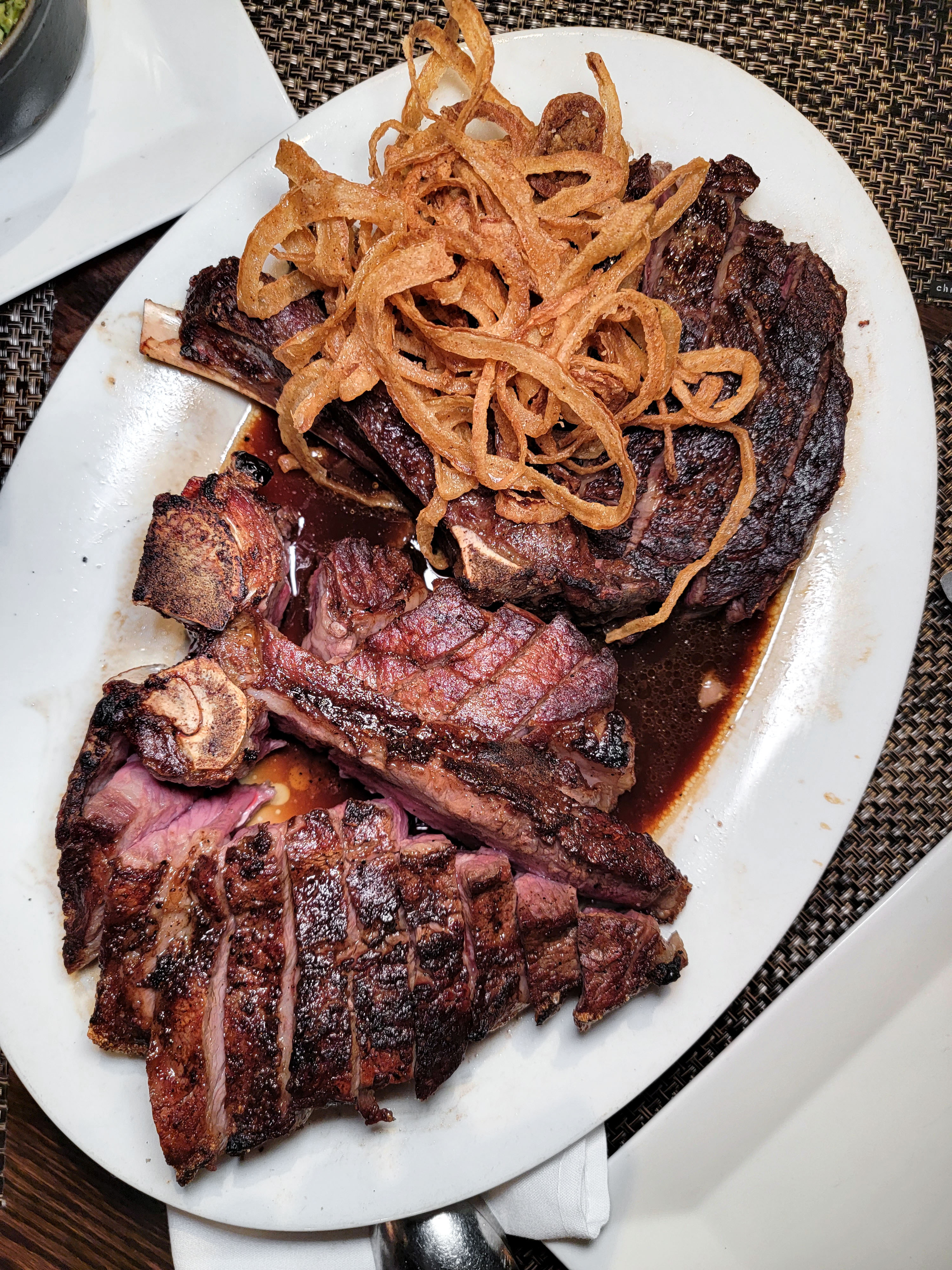 I had the 19oz bone-in filet, some onion rings, and the truffle mac & cheese. Big respect to our fun waiter Sarko, who guided me in the right direction to order the filet medium rare instead of rare. He explained that if it was boneless, then rare would be the way to go. However, since the bone inhibits the center from warming up fast enough, he cautioned me that some of the fat near the bone may not render properly unless I went to medium rare. It turned out perfectly. I was really happy with my hunk of red meat.