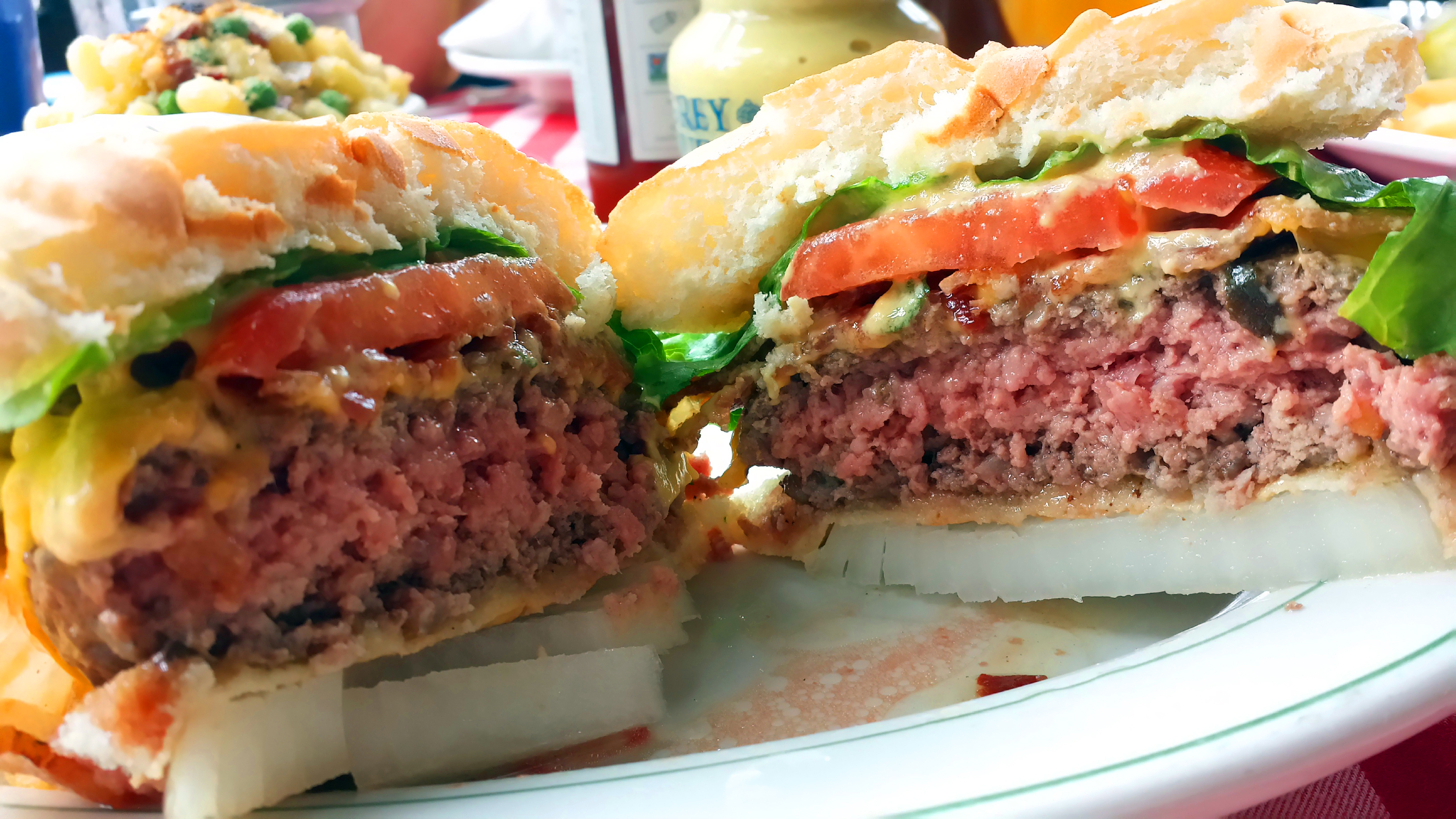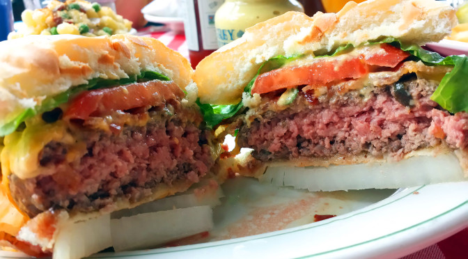 My burger was called “the Cadillac” – mostly I ordered it because it had American cheese and bacon on it. Look at the perfect cook job done on this bitch: