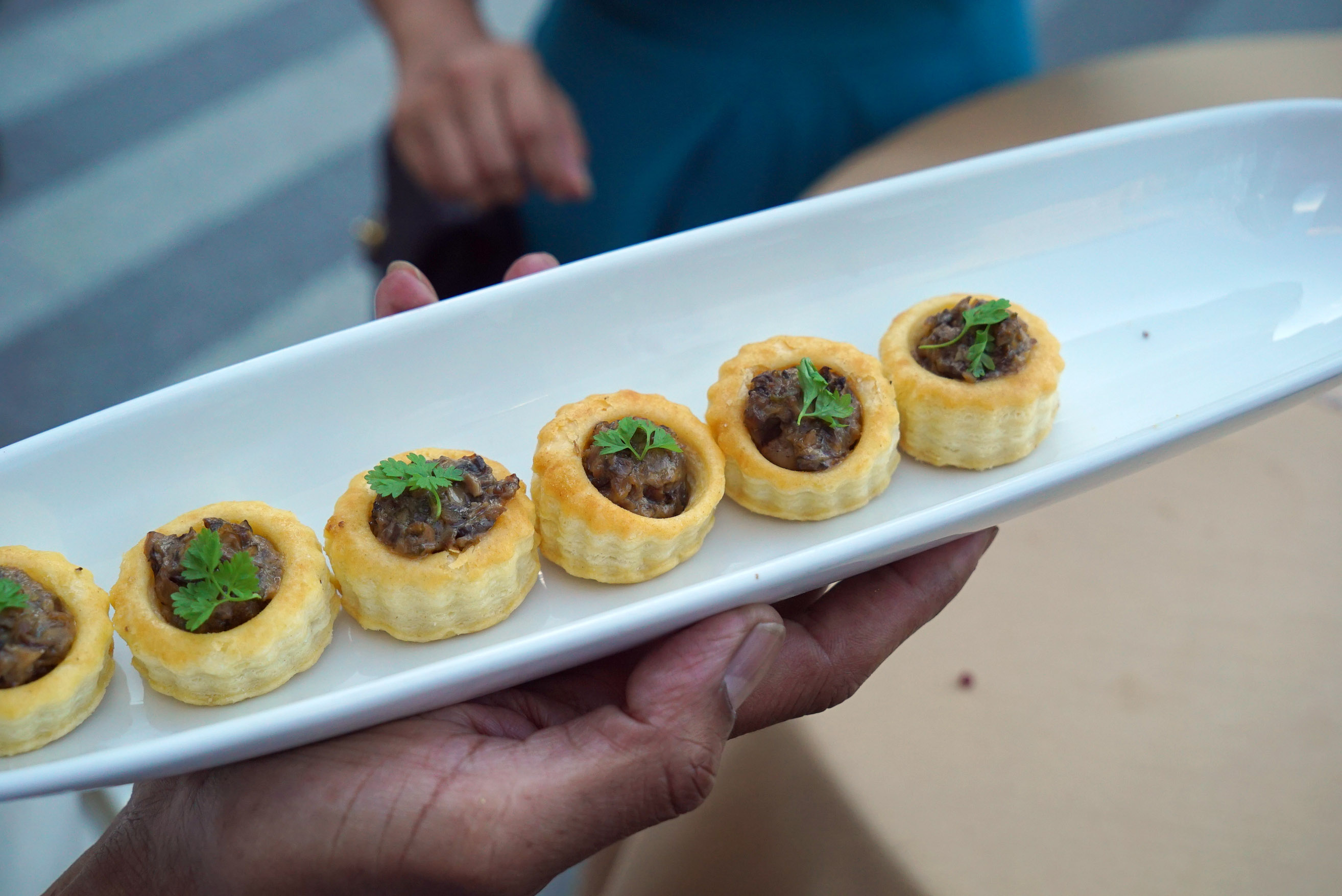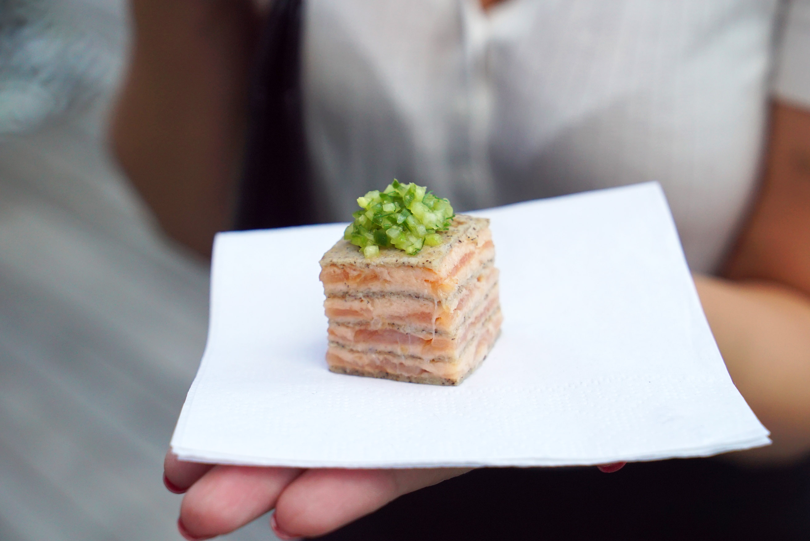Cocktail hour, obviously, served us some booze, but it also included passed Hors d’Oeuvres that consisted of mini lamb chop Provencal; crab Louis with Meyer lemon and chive on a house made whole wheat cracker; James River oysters on the half shell with mignonette caviar, micro chives and shaved horseradish; Scottish smoked salmon and cucumber mille feuille; traditional Angus steak tartare on ficelle crostinis; veal sweetbread with Madeira and morel mushroom vol au vent; and watermelon with feta crema, aged balsamic and micro basil.