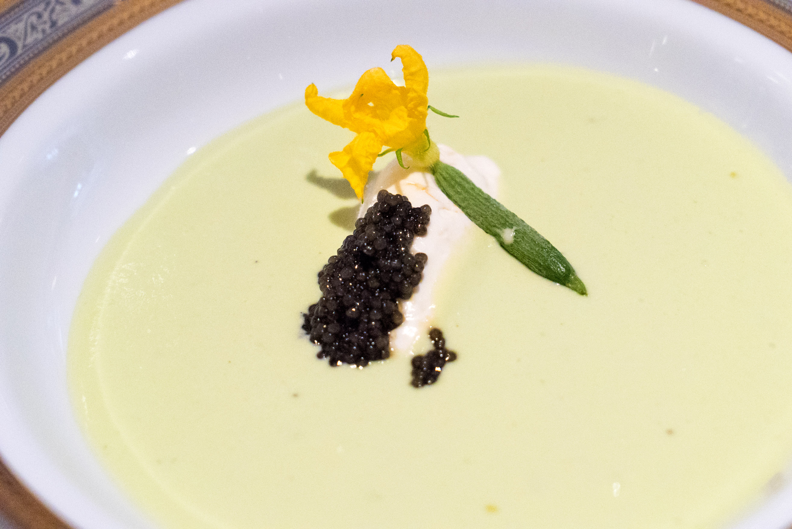 The dinner menu, inspired by the movie Titanic, started with a chilled vichyssoise with Meyer lemon creme fraiche, a baby squash blossom and Petrossian caviar.