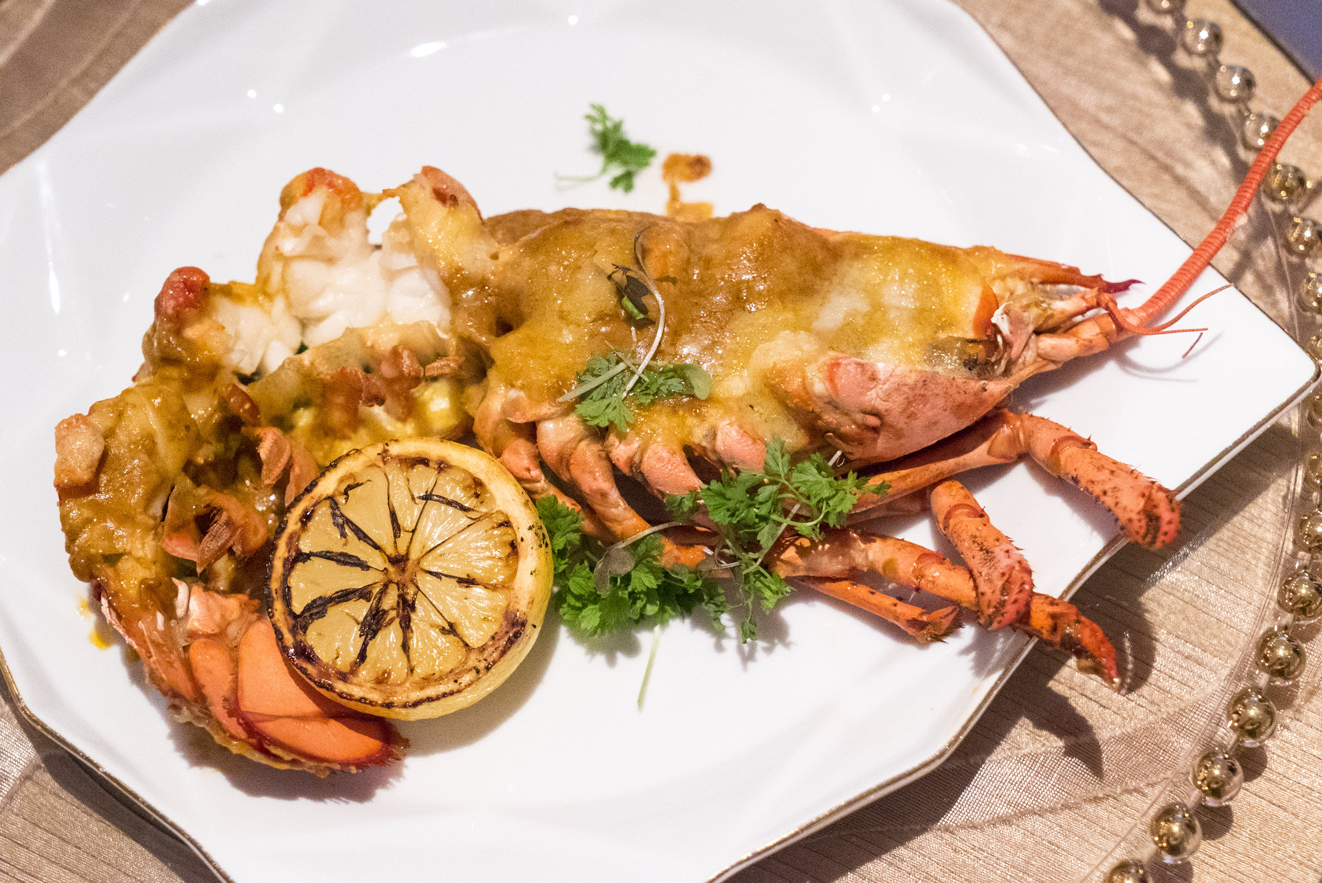 The fish course was Lobster Thermidor: Maine lobster with spinach, parmesan, bisque and XO cognac.