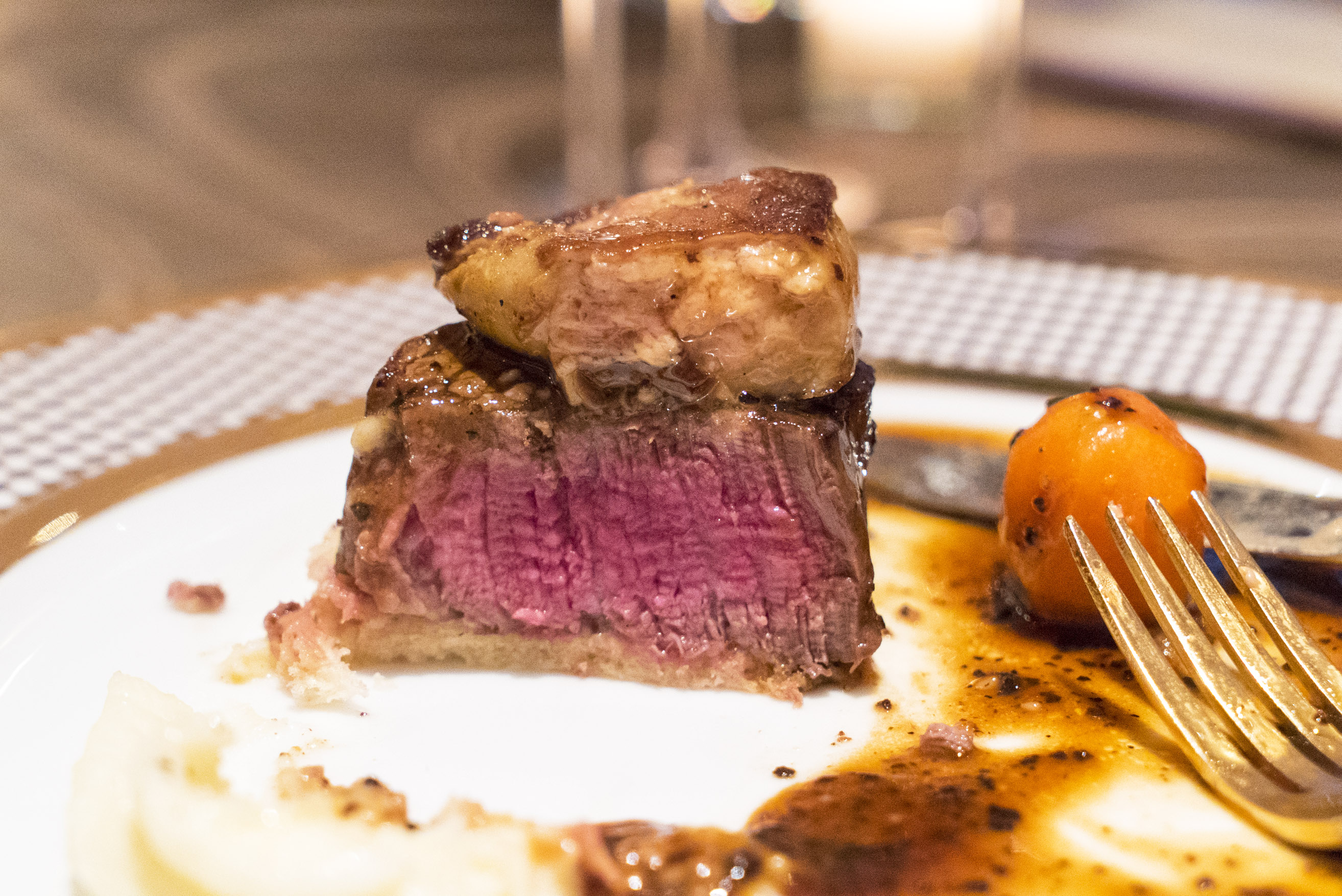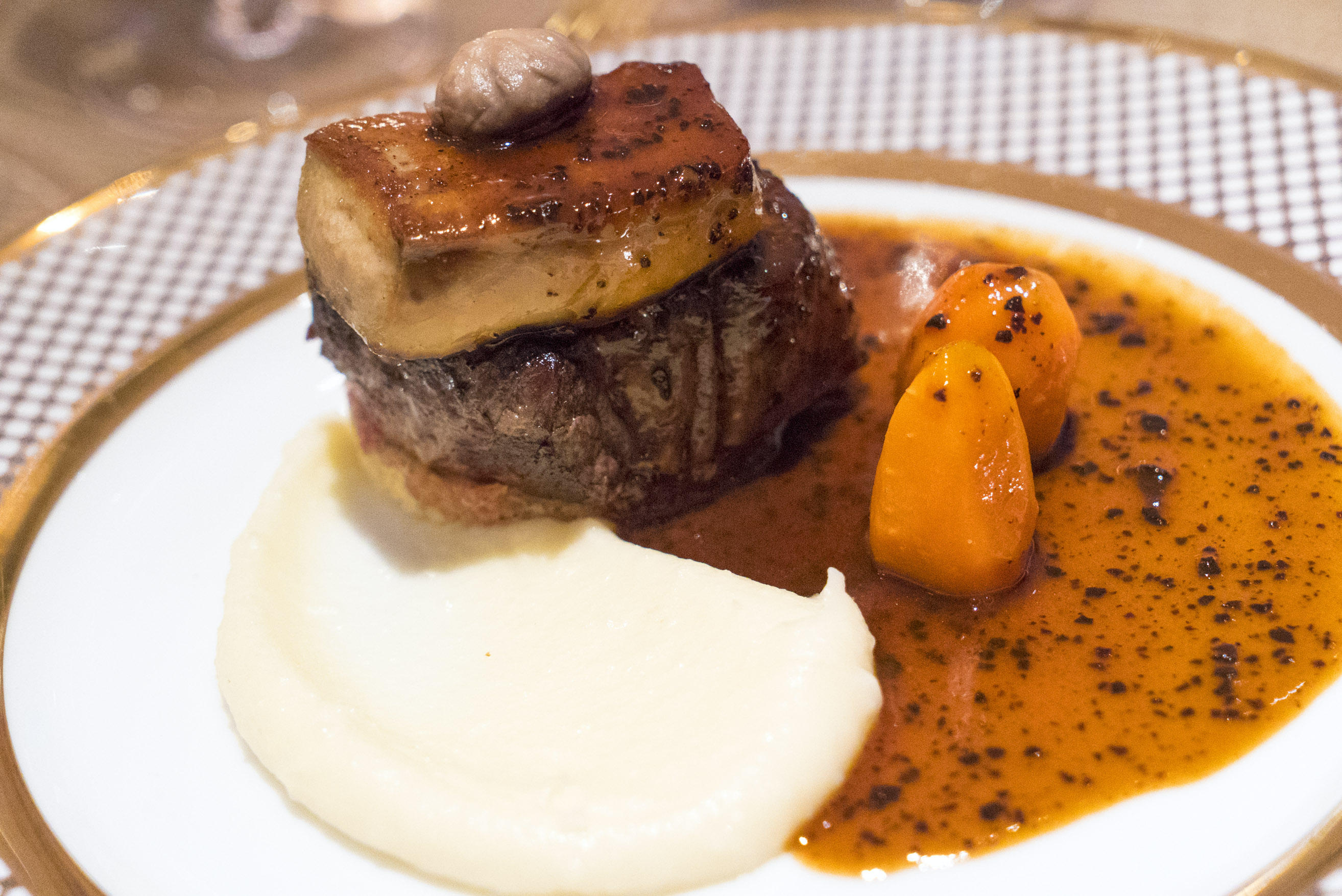 The entree was Tournedos Rossini (beef medallion/filet mignon) with foie gras, truffle Madeira jus, Thumbelina carrots and pommes puree. Beautiful.