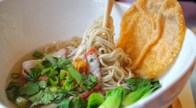 The broth was packed with flavor, yet thin and clear. It was served with thinly sliced roast pork, fresh baby bok choy, scallions, cilantro, and a fried egg roll wrapper of some sort. The noodles were ramen style, and cooked just right.