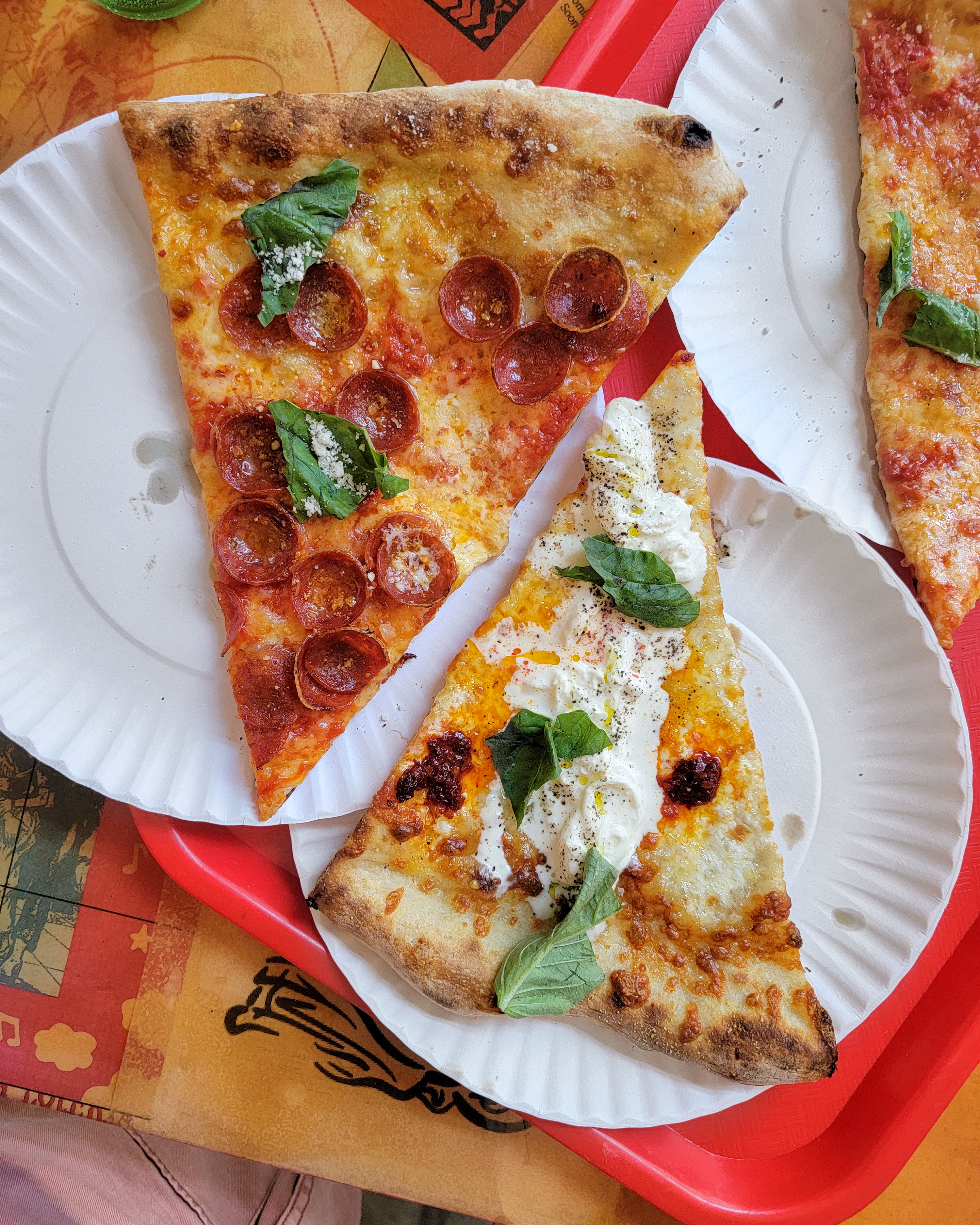 I tried the pepperoni slice, and the “fire and ice” slice. I think I preferred the “fire and ice,” which seemed to be fresh burrata and Calabrian chili “bomba” style sauce. Incredible! Great crust, no flop, quality toppings.