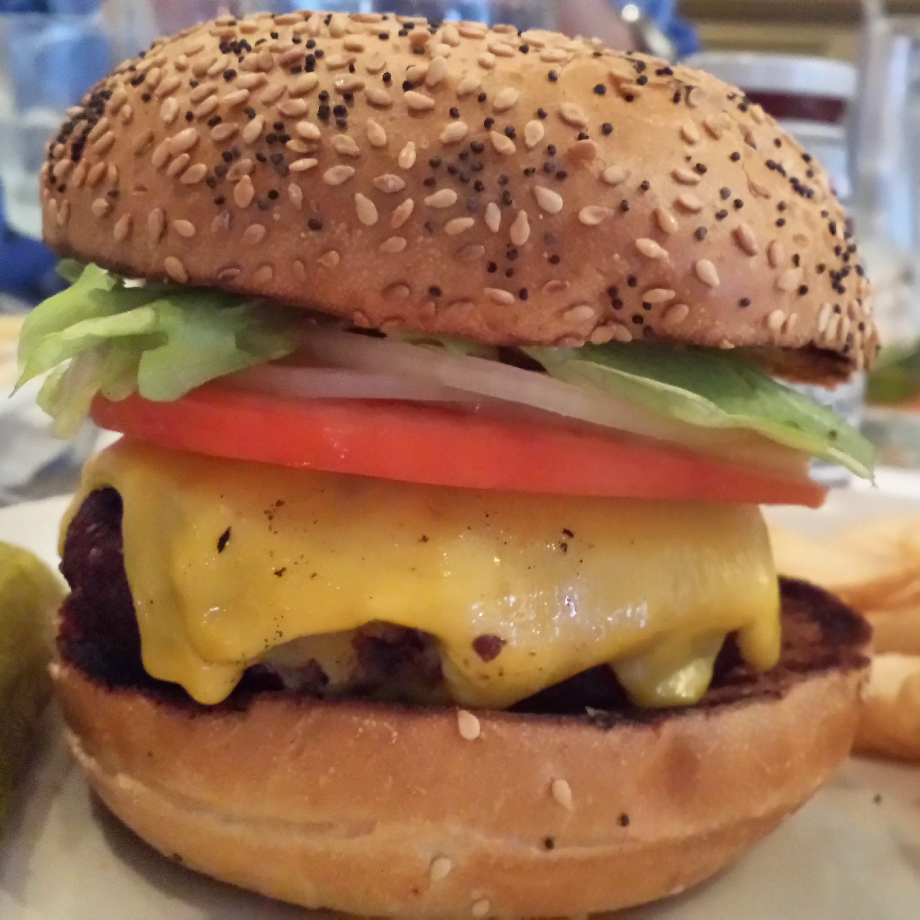 So I took down their burger. I had a feeling it was going to be thick, so I didn’t go crazy with toppings: just cheese. I was right. Look at this fat fuck: