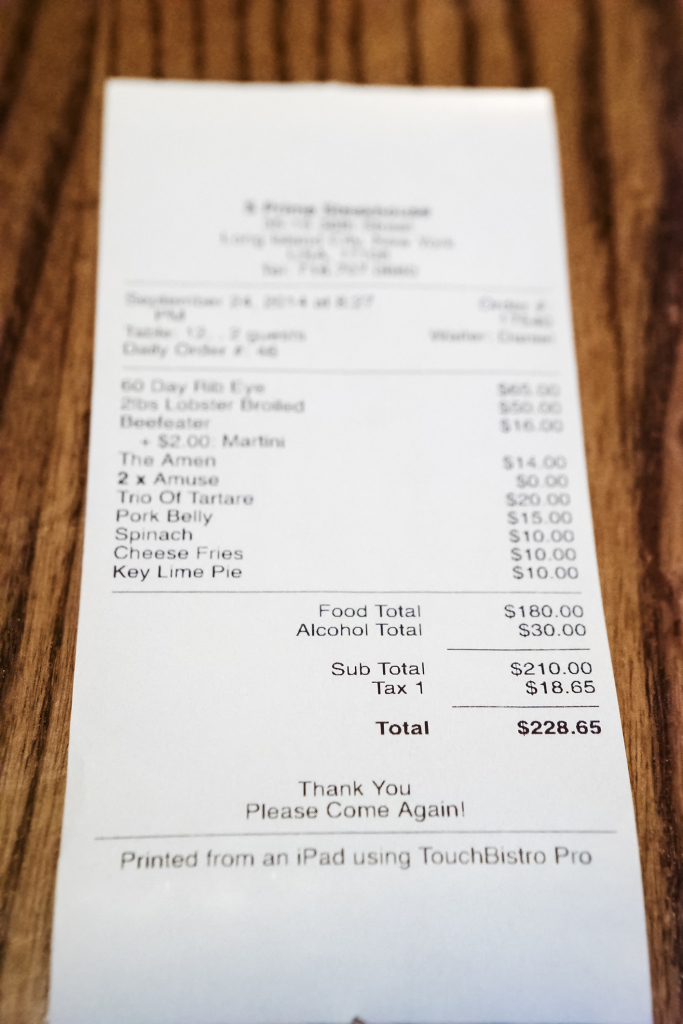 The prices here are pretty high for Queens, but the quality offsets that damage. Also, with their long-running Groupon deal, there is really no excuse not to come try this place out. Don’t let the pricey steaks deter you. Our bill for two came to $228 (not including the oysters and 2 drinks at the bar), minus $100 for the Groupon. Not bad.