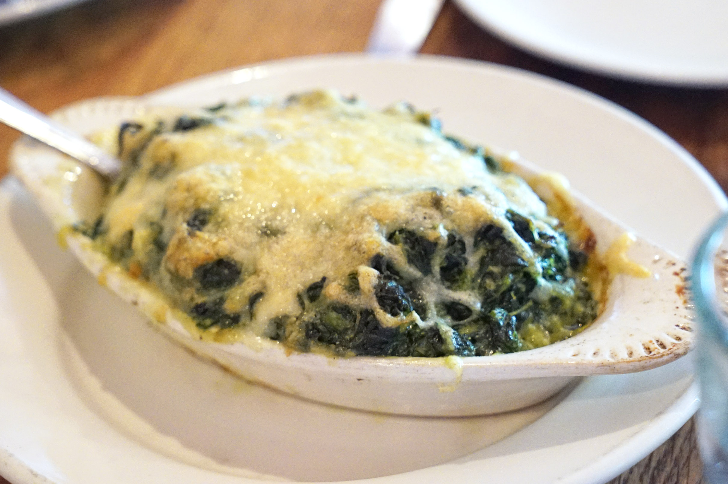 Last, we tried the spinach gratin. The spinach was nice: not overly creamy. It was on the dry side, which I wasn’t sure that I liked at first, but it grew on me. The cheese on top was hard and didn’t really mix into the spinach too well. It was more of a crust on top.